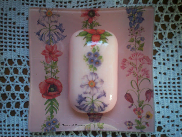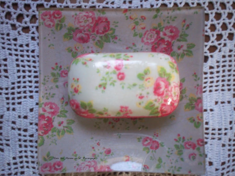 Unas jaboneras que ya tenía desde hace tiempo hechas, los pasos, una bandejita de cristal, servilleta pegada con cola decoupage, la de los niños y la primera de flores craquelada, la otra solo pintada. Y el jabón, elijo servilleta, recorto el motivo y pego con cola vitrificable para poder usarlo, y listo, quedan super chulas, me encanta hacerlas.