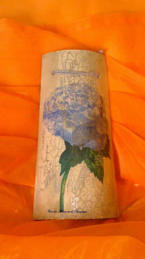 Una teja, se preparan con dos manos de imprimación, lijadita. Elegí un motivo de servilleta floral, esta fue a mi gusto, craquelada por zonas, y envejecida con betún de judea, queda con un acabado muy rústico.