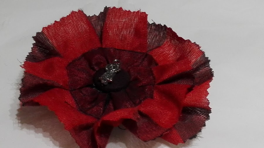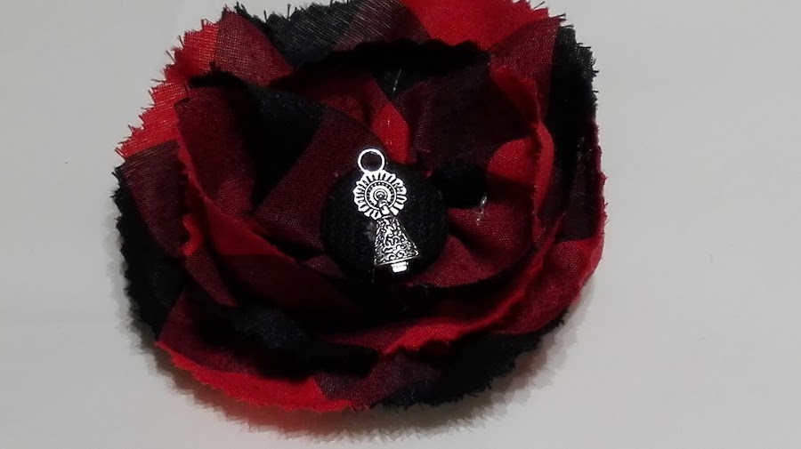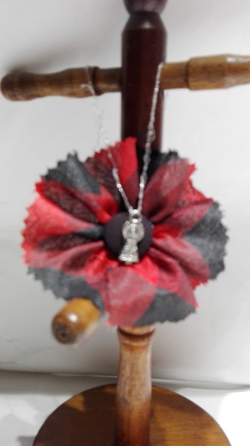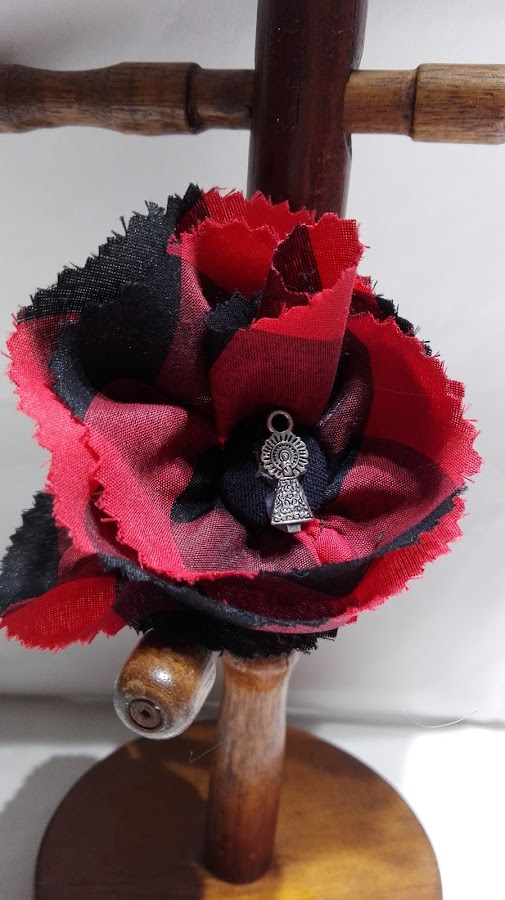 Realizadas con tejido de cuadros rojos y negros (clàsico pañuelo aragonès), y apoyando a la Virgen en un botón forrado.