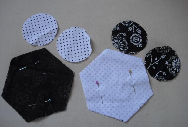 Para a primeira parte do fuxico: a) corte 5 círculos de 6cm de diâmetro com um tecido florido. b) corte 7 círculos de 6cm de diâmetro de um tecido liso. Pegue o tecido florido do lado do avesso. Dobre-o ao meio. Pespontar até o meio do semicírculo Colocar o enchimento. Continuar a costura até fechar o semicírculo. Puxar a linha para franzir e dar um nó. Faça a mesma coisa com os outros círcu ...