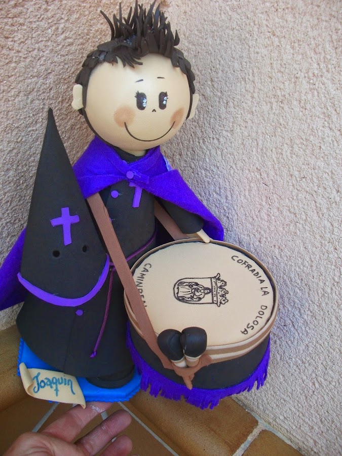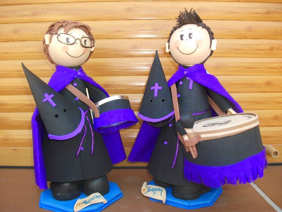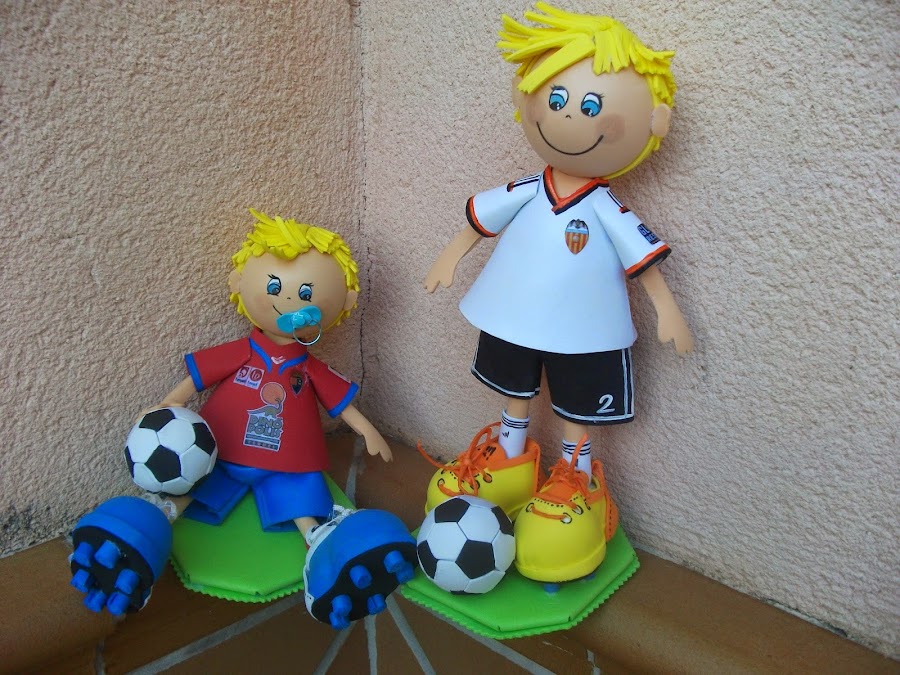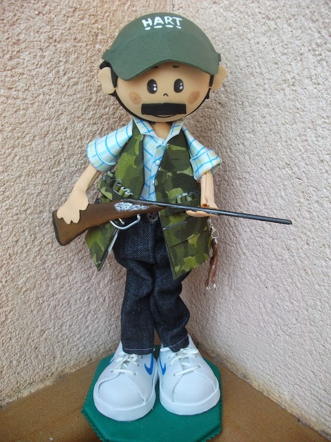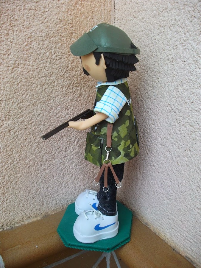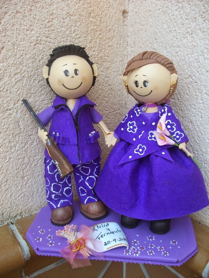 Fernando y Elvira quisieron obsequiar a sus padres el día de su boda con un fofucho cazador y otro de pastor, y a sus amigos una indirecta para su próximo enlace, y ellos quisieron para la tarta unos novios de lo mas original, los novios de las camisetas que les regalaron sus amigos el día de la despedida de solteros.