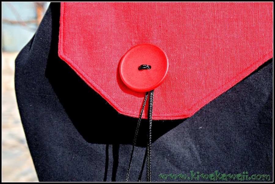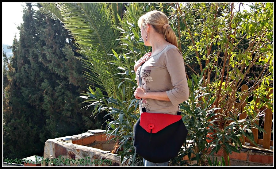 Combinando lonetas negras y rojas, con bastante fondo para que tenga buena capacidad, y una solapa asimétrica para quitarle la seriedad de los colores.