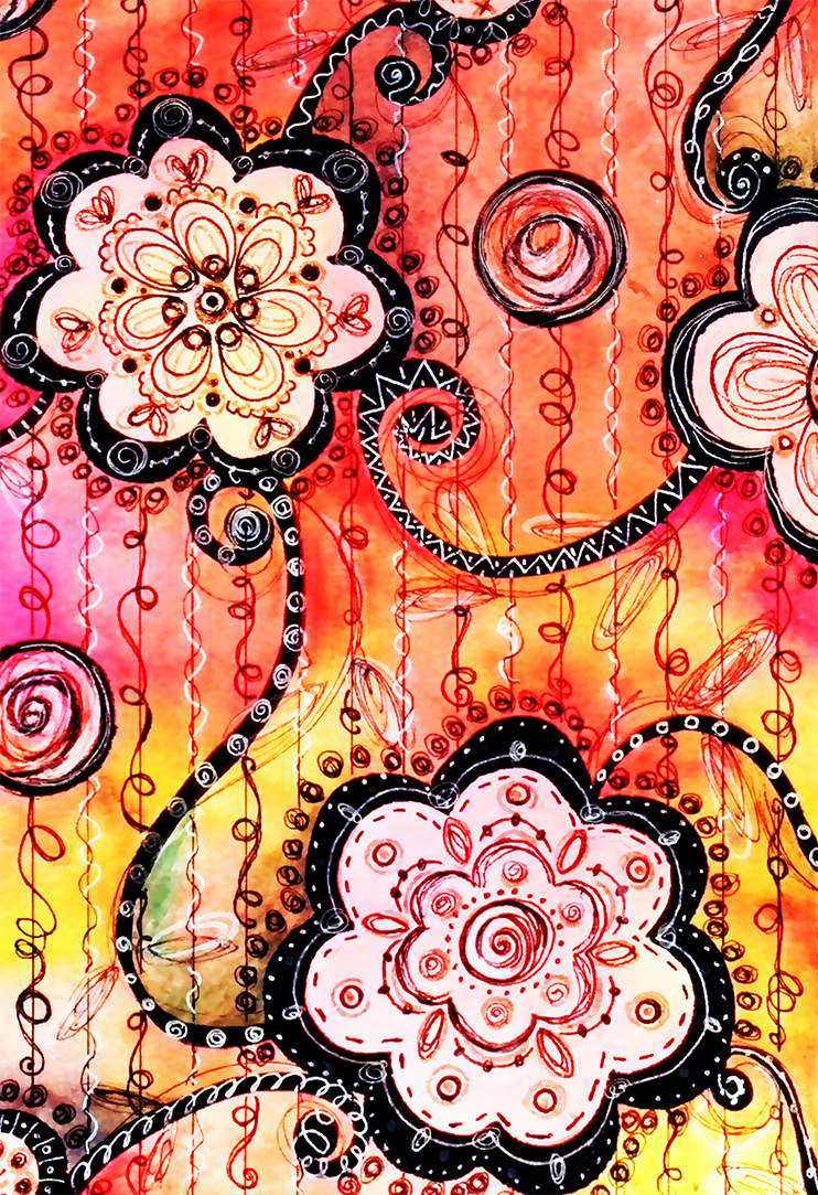Després de jugar amb les aquarel·les o anilines, aiguant, difuminant i eixugant, hem dibuixat amb retolador blanc les flors; al no ser opac, dóna un efecte desgastat. Amb retoladors negres de diferent gruix hem perfilat i dibuixat els ornaments i les branques; hem acabat donant llum amb retolador blanc punta fina. L’efecte envellit del fons, l’hem aconseguit amb llapis de color aquarel·lables, partint d’un punt i difuminant fins que quedessin integrats al fons.