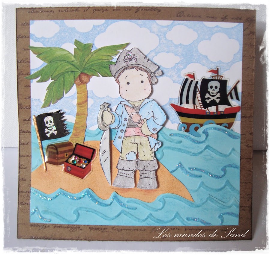 El papel de la isla lo he lijado y entintado con distress tea dye para dar un aspecto más arenoso, la palmera, barco, tesoro y bandera son impresos y sticks, las olas es un embosado retocado con stickles waterfall, las nubes una estampación de querida Patri (Yudish) y el magnolio pirata una estampación de mi amiga Esther (Chunli). El magnolio pirtara tiene glossy acents en la espada y stickles crystal en los botones y sombrero. Espero que os guste y !Al abordaje!