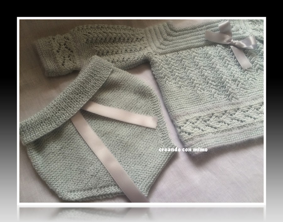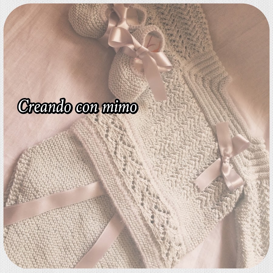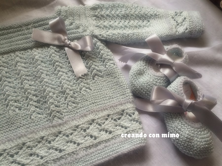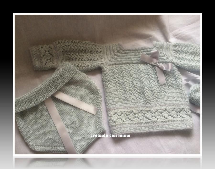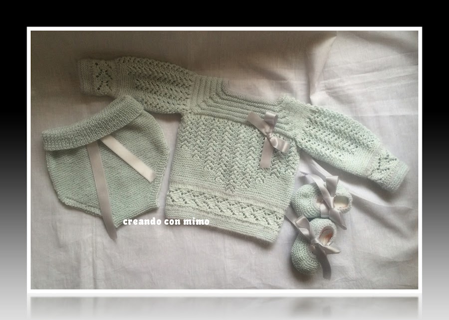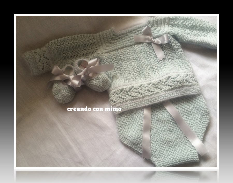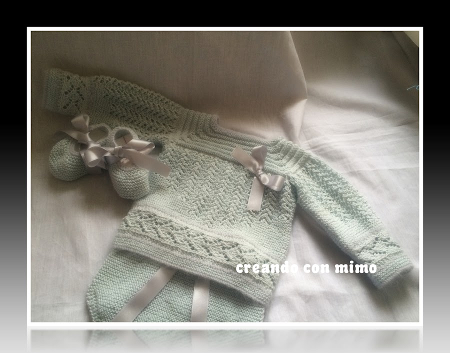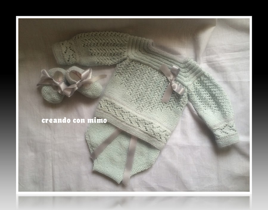 El jubon o jersey, era un prototipo , una especie de experimento que una vez acabado me dejo sorprendida por el resultado tan dulce , por lo cual decido completarlo, un cubrepañal y unos lindos zapatitos. Y enseguida le surgio un dueño ALAIN, asi que ya esta en su ajuar esperando a recibirlo por alla por abril/mayo.