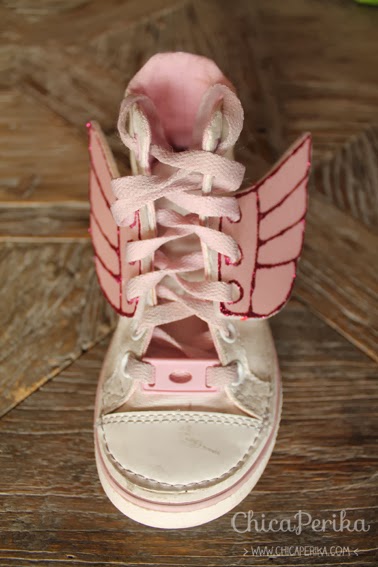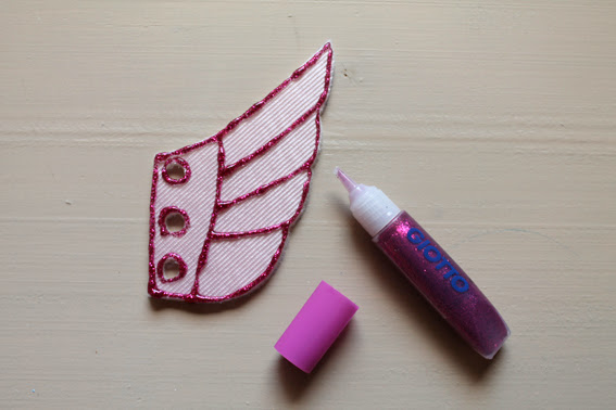 Luego hice el cortorno de las alas, y los agujeros con el pegamento y la purpurina,