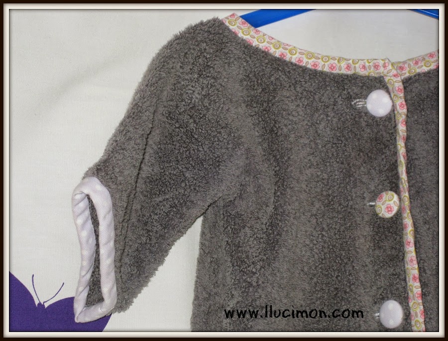 Es muy fácil de hacer, si veis las instrucciones en la página que os he comentado no es necesario tener conocimientos elevados de costura, sólo se trata de cortar la toalla en doble con forma de T y coser los lados, no hay sisas, ni cuellos ni nada... Después simplemente la rematé con bies (en mi caso diferente en las mangas que en el cuerpo) y los botones que le puse fueron forrados con la misma tela del bies. Los botones los forré con el sistema de botones forrados que tenemos en nuestra tienda.