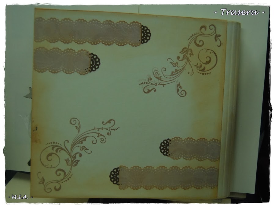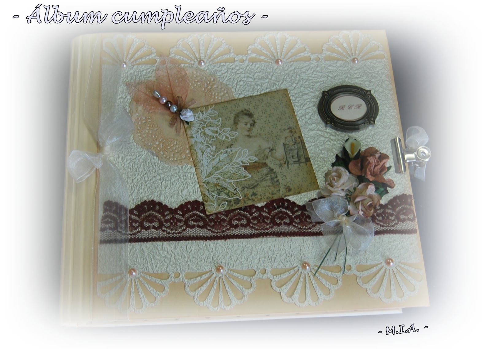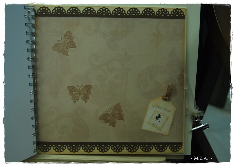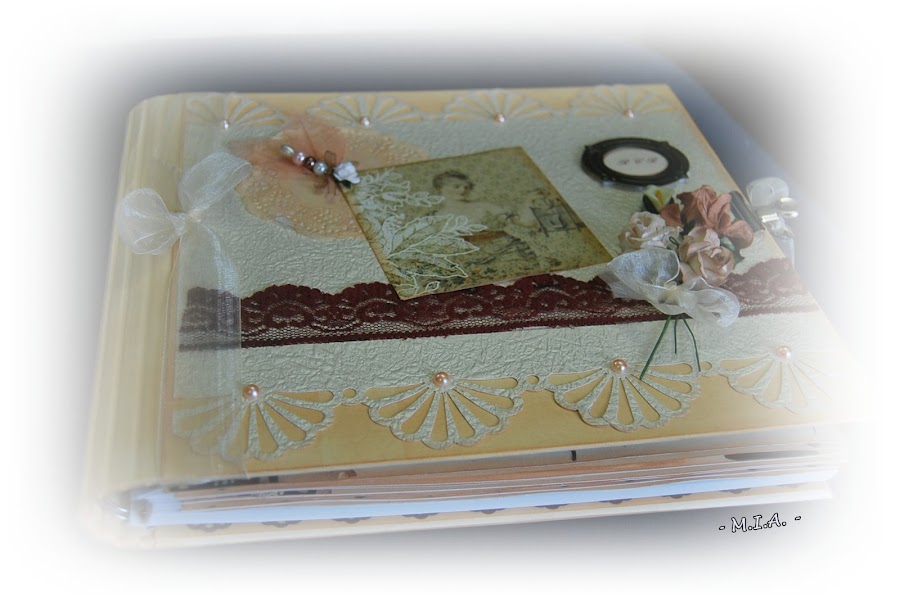 Para la portada elegí un papel nacarado y granulado precioso, con el borde troquelado con la troqueladora de Martha Stewart y una perlas con un ligero tono rosado. Un recorte de un papel de la colección "Butterfly Botanical Garden" de Pink Paislee, una mini blonda entintada con distress sepia vintage y un alfiler casero en una esquina, sobre dos esqueletos de hojas en tonos marrones. Un bouquet de flores atado con una lazada de lazo en color crema y un adorno ovalado de metal de Prima con las iniciales de la homenajeada. Y haciendo contraste un encaje en tono burdeos terminan la portada.