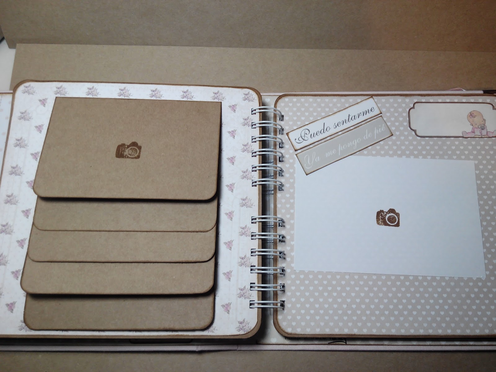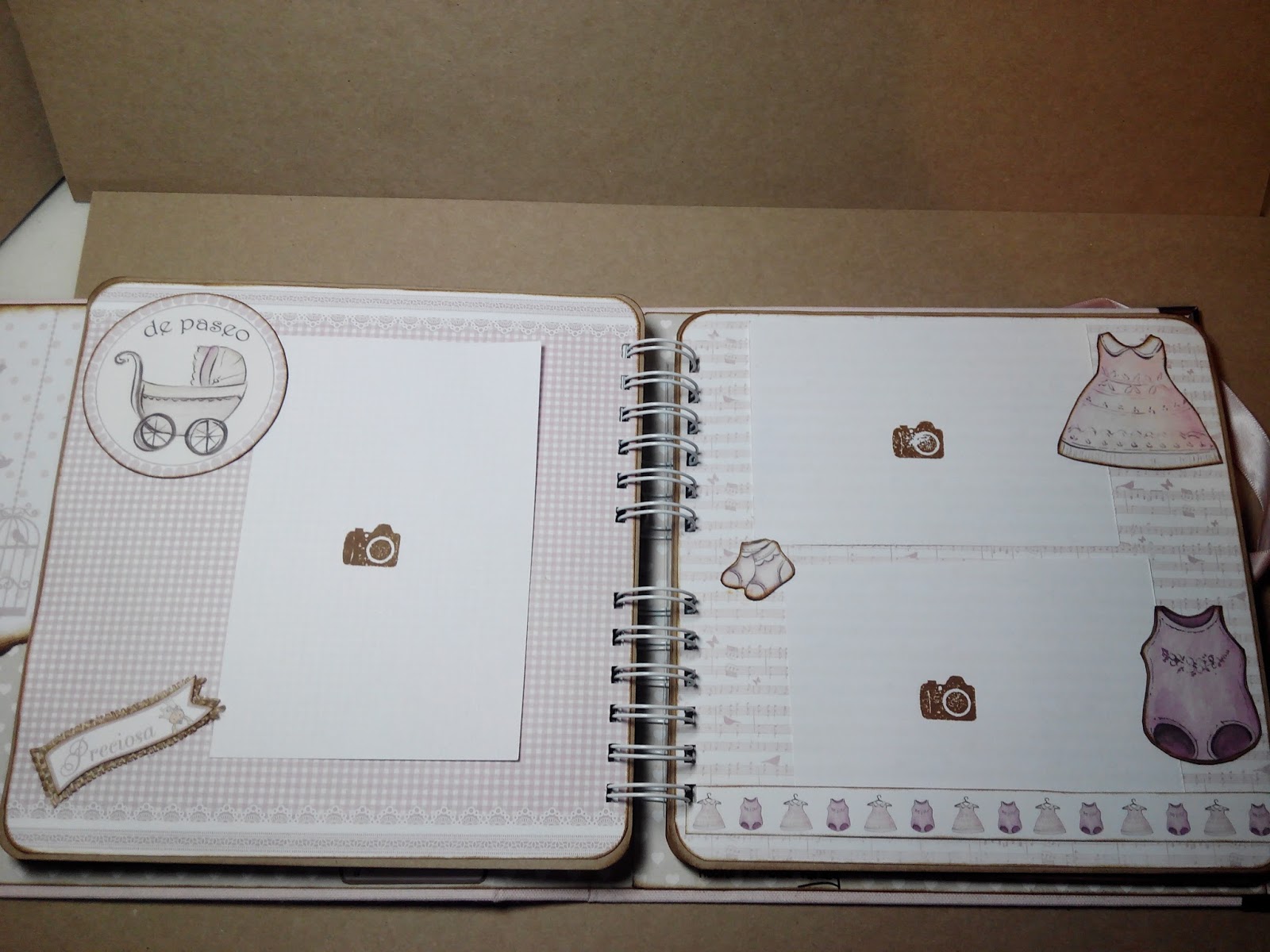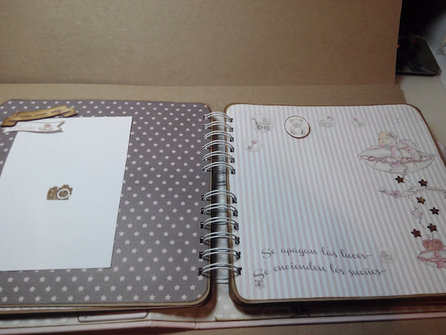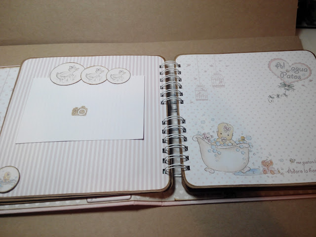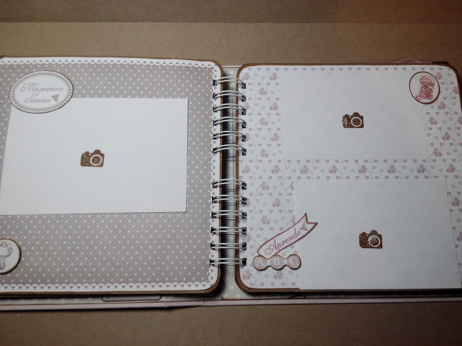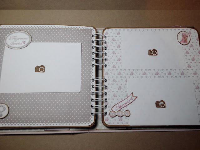 Las portadas están forradas con tela de encuadernar color rosa bebé y las hojas del álbum, esta vez en cartulina color craft, que dan un contraste muy bonito.