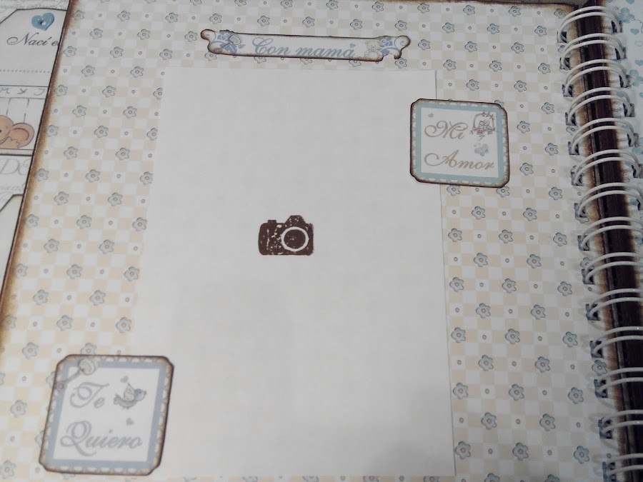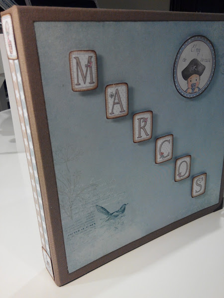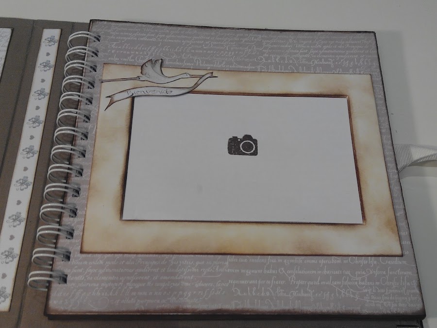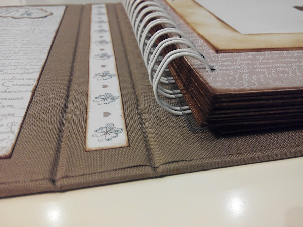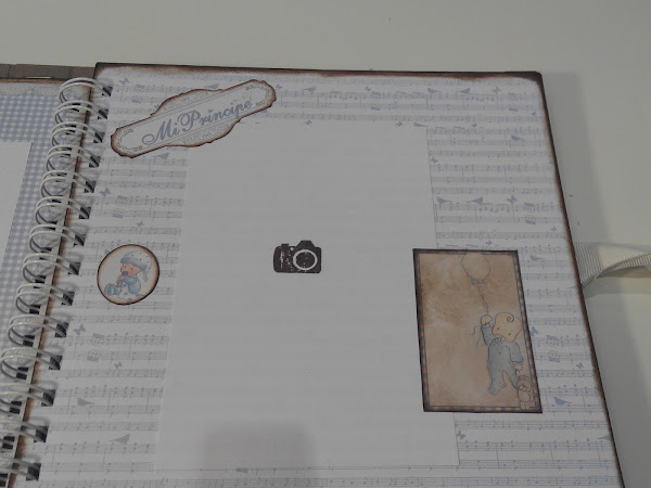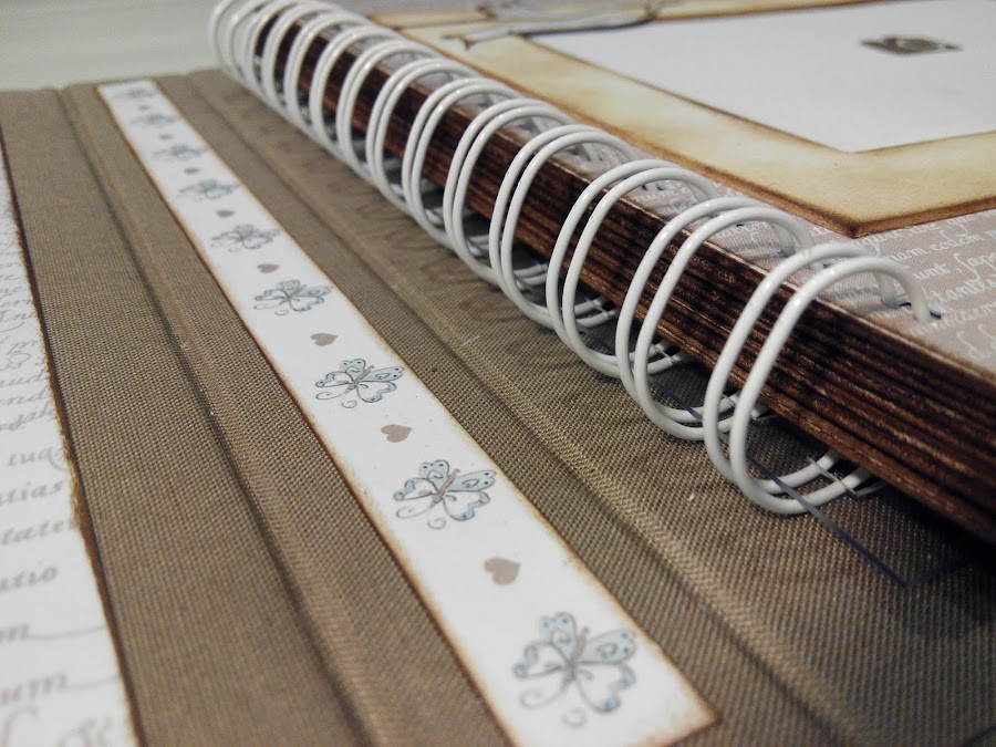 Toda la estructura del álbum esta forrada con tela de encuadernar color marrón (quería probar cómo quedaba, y me gustó mucho), y sobre ésta, los papeles pegados. El interior consta de un álbum de anillas cogido a la última página con una lámina de acetato en el interior de un sobre. Aquí podéis apreciarlo.
