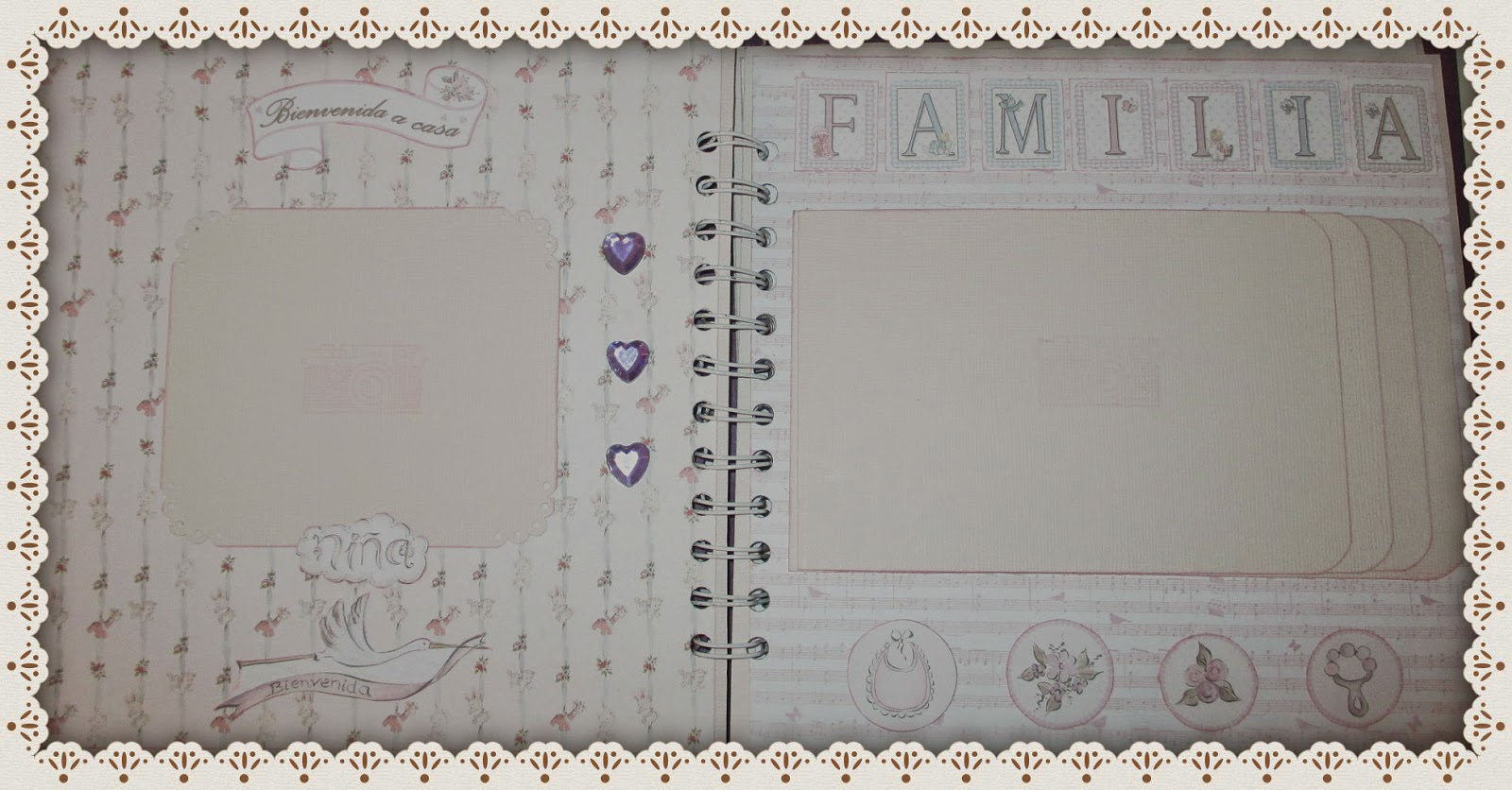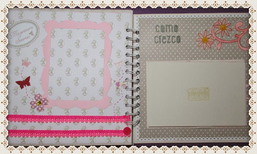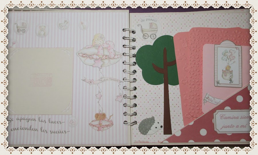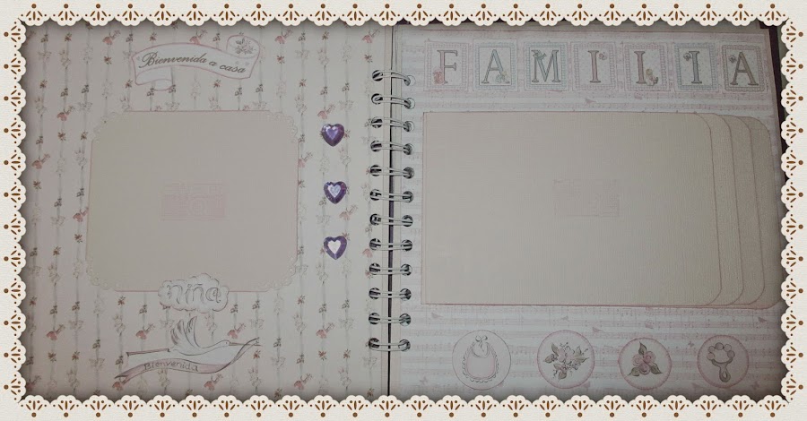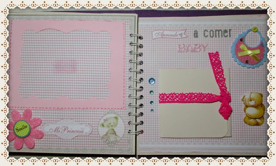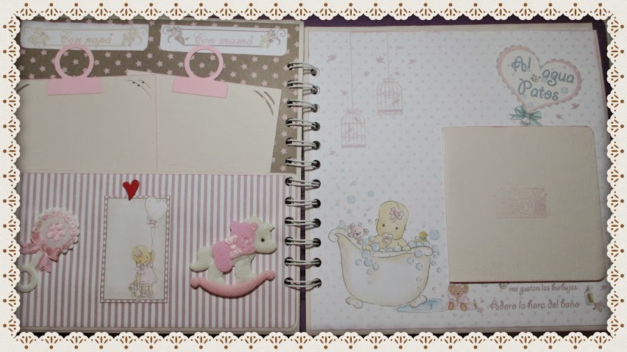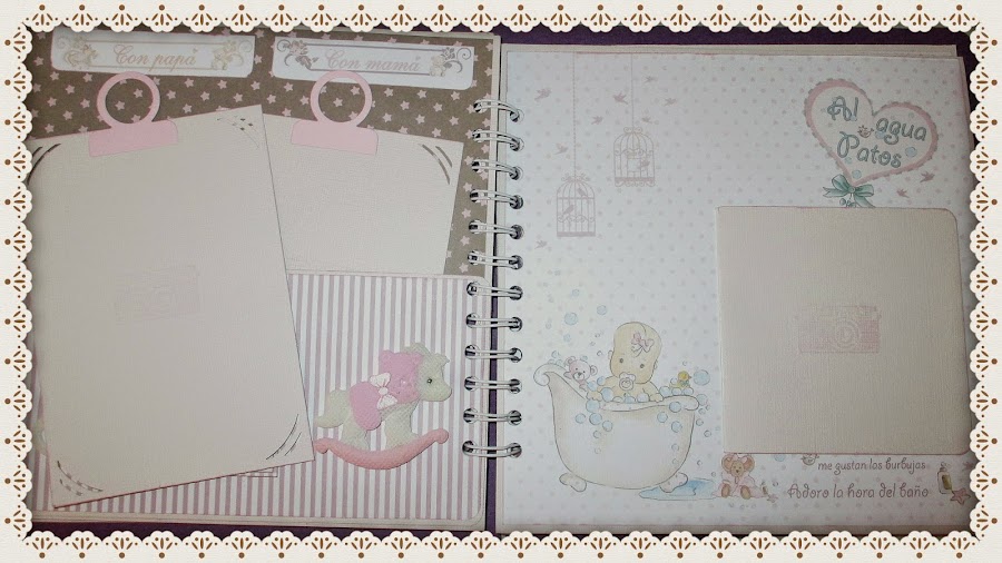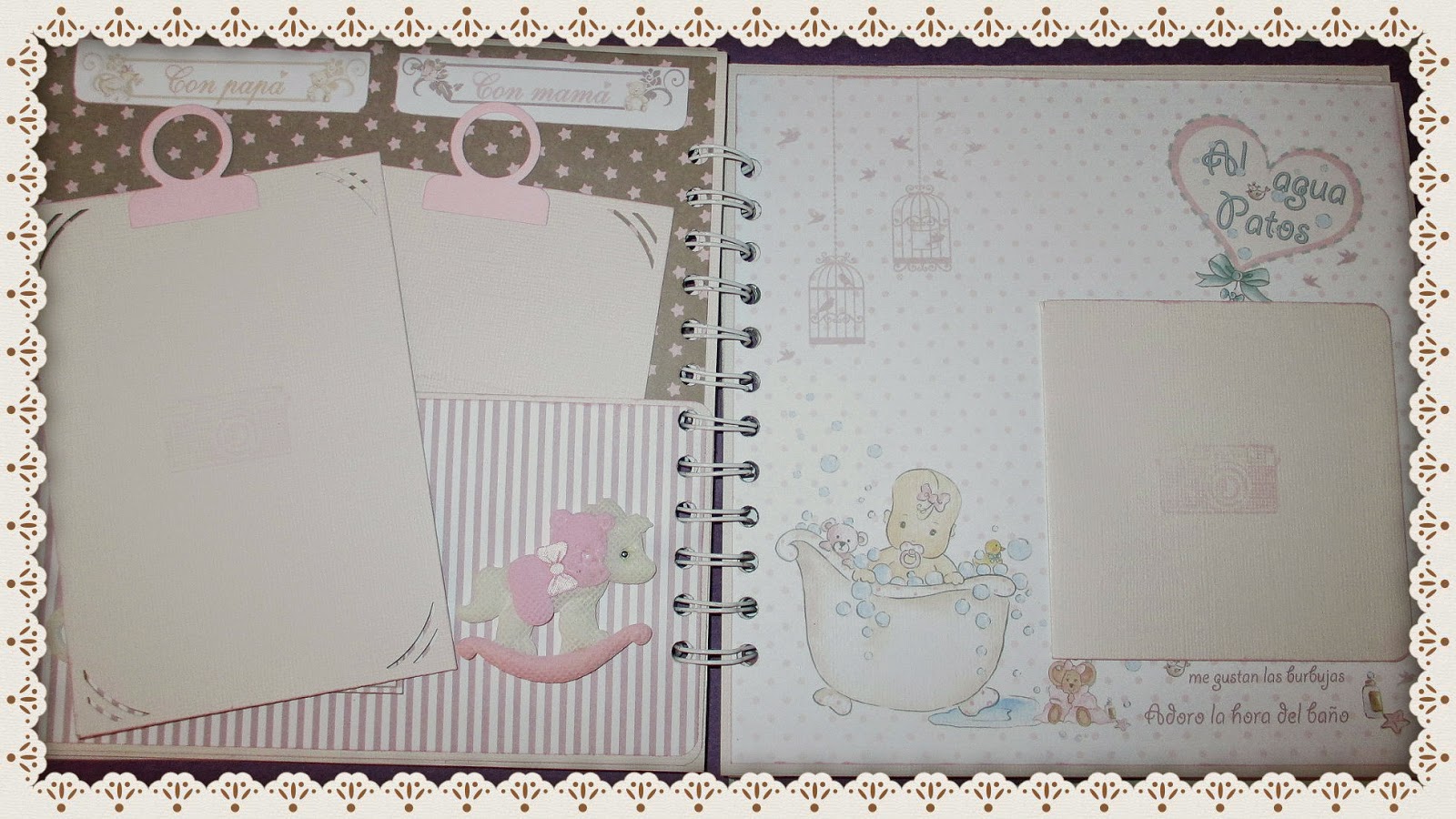 Esta entrada estaba pendiente de publicar desde Agosto, pero publicando otros trabajos se ha ido retrasando, creo que a estas alturas le toca salir, para que todas podáis opinar sobre el. Lo realice para hacer un regalo a una pareja de futuros papas, que estaban esperando una niña, la verdad es que mientras lo hacia estaba muy nerviosa, primero por no haber realizado nunca un álbum de bebe y la otra por que ellos no tienen ni idea de lo que es el scrapboking, ¿y si no les gustaba el regalo?, que chasco!!, puse todas mis ganas en hacerlo, no lo recargue mucho, lo hice sencillo, no quería liarlos mucho con desplegables y bolsillos ocultos, pero si que quería que pudieran poner bastantes fotografías, ya que la medida es de 20x20cm. Lógicamente el color predominante del álbum es el rosa y blanco, la colección de papeles es de Dayka, especialmente diseñado para un álbum de bebe, 24 hojas de doble cara preciosas, en las que hay un alfabeto, etiquetas y recortables, también use tinta Memento angel pink, cintas, botones y diversas pegatinas, la portada y contraportada estan realizadas con carton para encuadernar en color lila y todo ello rematado con la cinch.