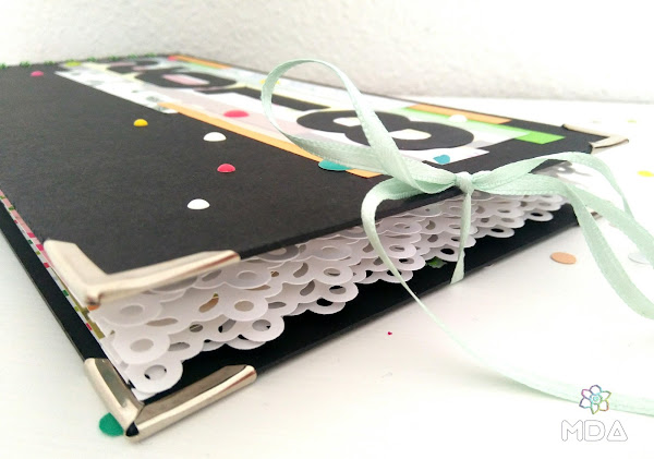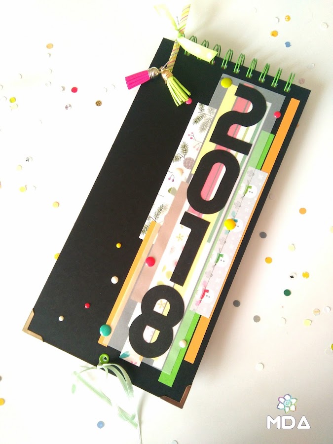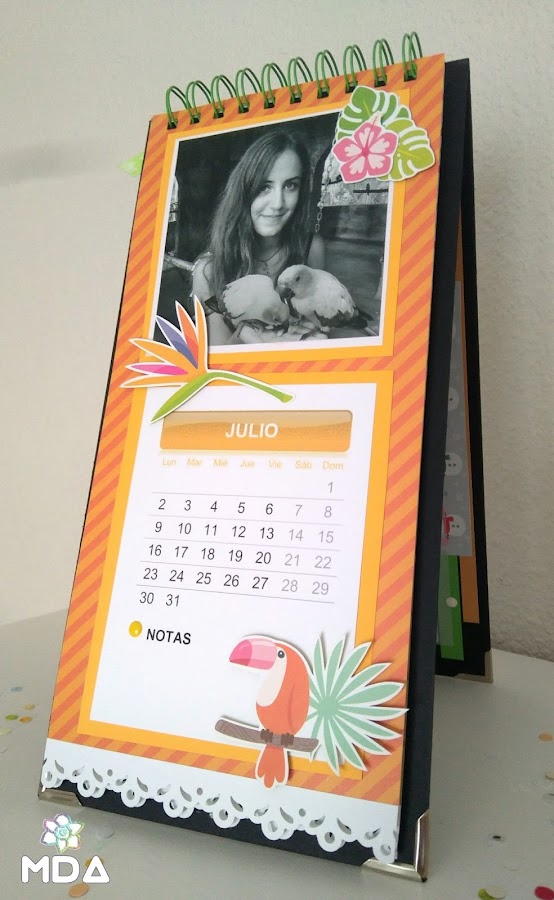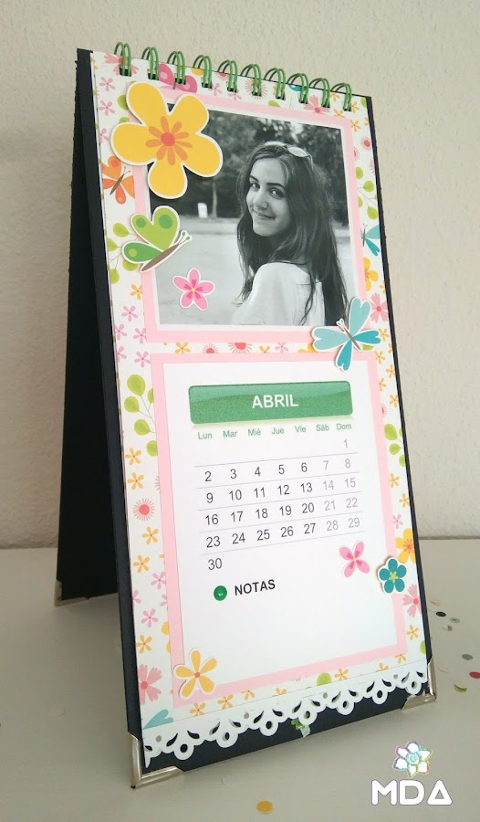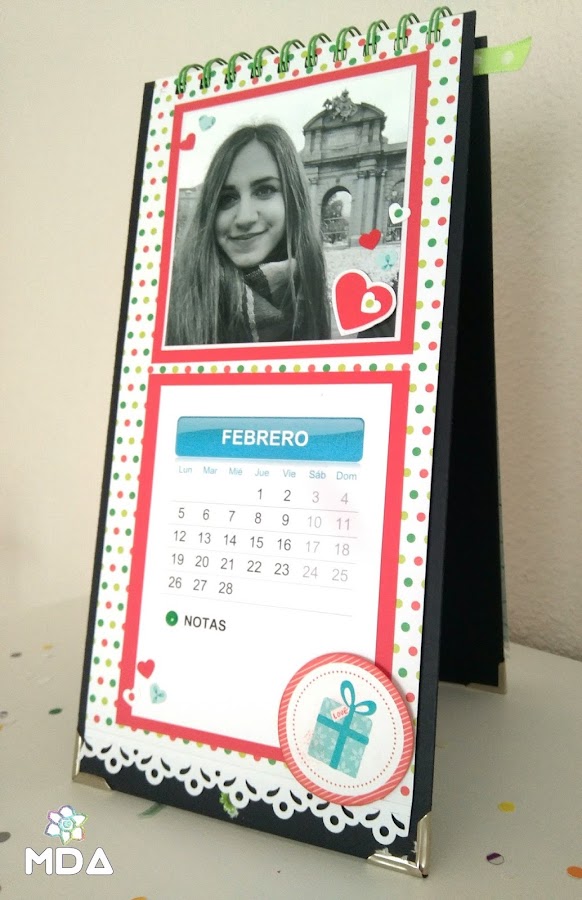 Cada página, además del mes y un espacio para notas, lleva una fotografía. En mi calendario he optado por usar fotos en blanco y negro para no liarme demasiado con el tema de los colores. Está encuadernado con una espiral en verde (usando la Cinch) y con tapas en cartón contraencolado negro.