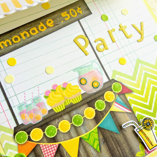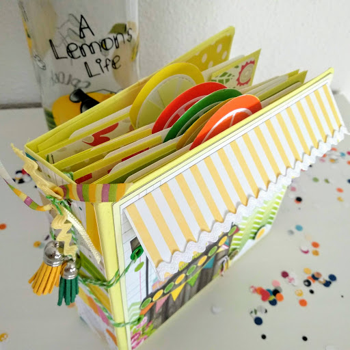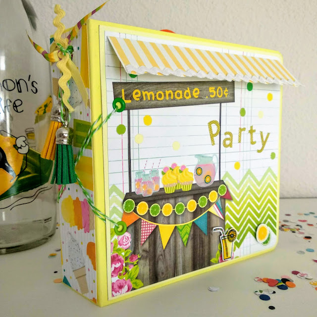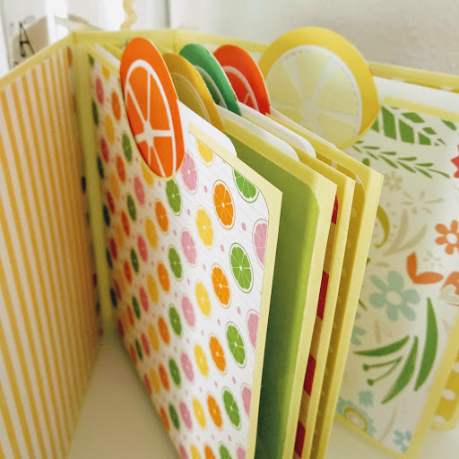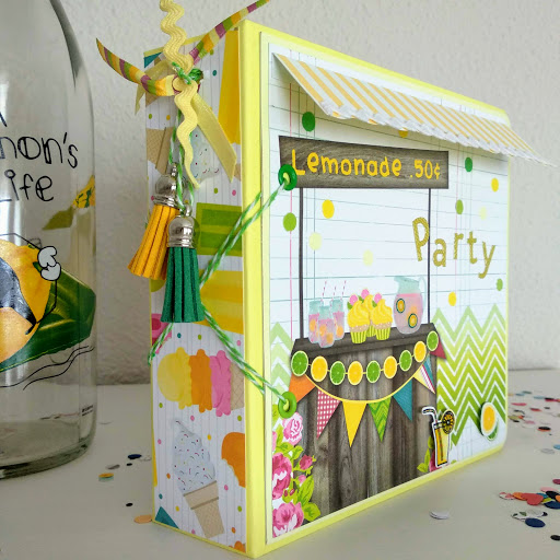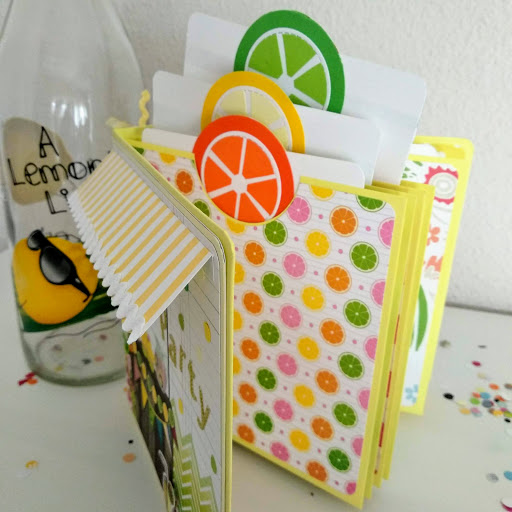 Para la portada, elegí un papel con carrito de limonada incluido al que le añadí algúna que otra decoración más. Para el lomo, unos adornos a tono en los mismos colores.