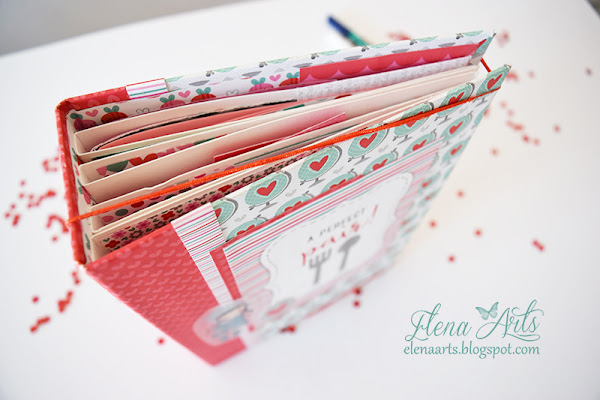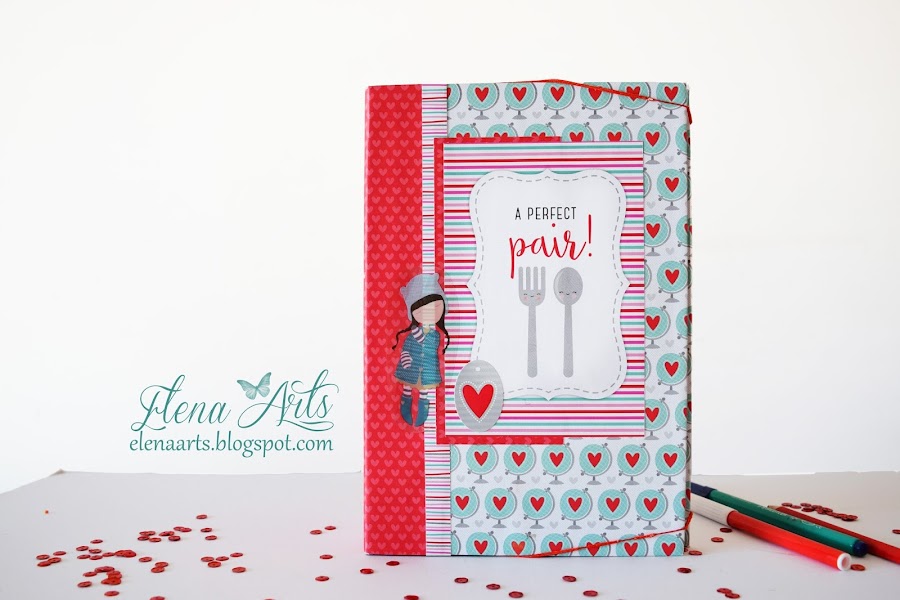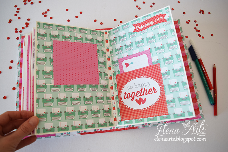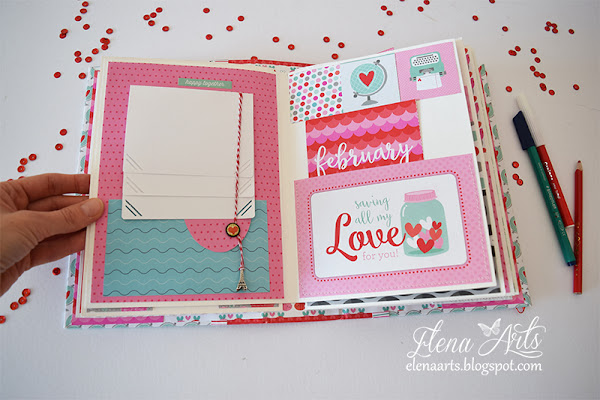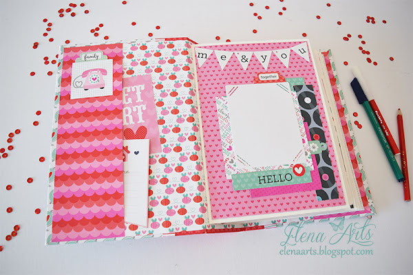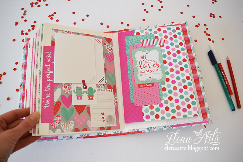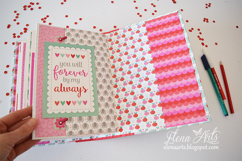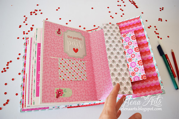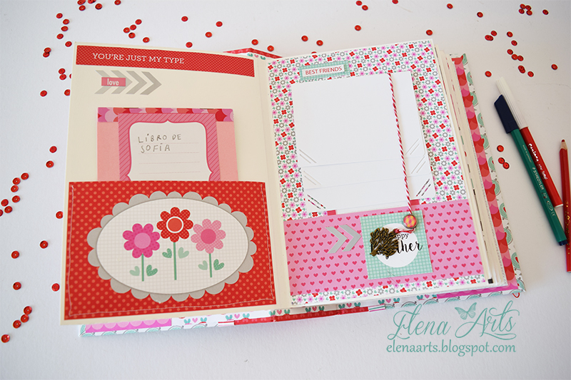 Así que aquí van unas cuantas fotos del interior. Ya veis que es muy simple a nivel decorativo, solo usé el kit de una colección de papeles que llevaba las pegatinas, tarjetas y unas tarjetas de otra colección. Pero lo que más me gusta es que tenga muchos bolsillos, solapas y compartimientos secretos. Bueno, no os digo que a Sofía le ha encantado tenerlo en sus manos y poder empezar a llenarlo con sus cositas.
