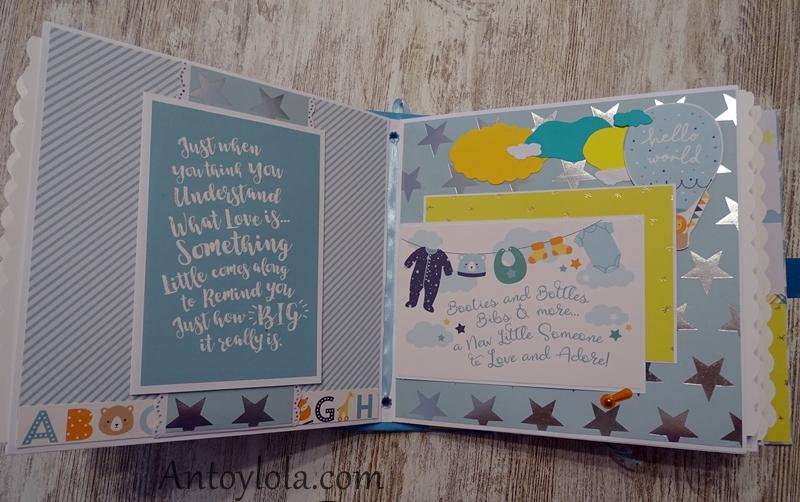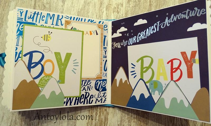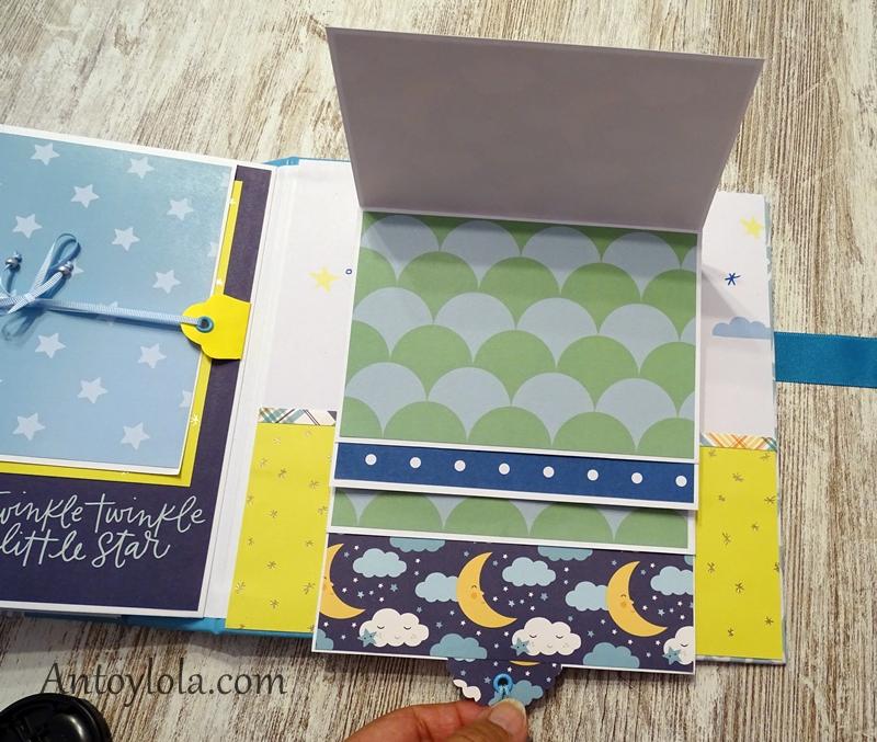 la primera hoja va doble y en ella va el espacio para poner las fotos del primer año de vida del bebé. En cada ventanita lleva un desplegable para dos fotos de cada mes y se cierra con iman.En esta página hice una ventana doble y dentro formé unos sobres para poner las etiquetas para escribir los datos del nacimiento, Las diseñé yo misma porque la colección no llevaba.