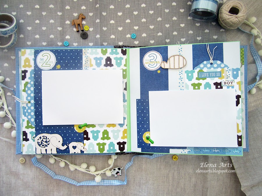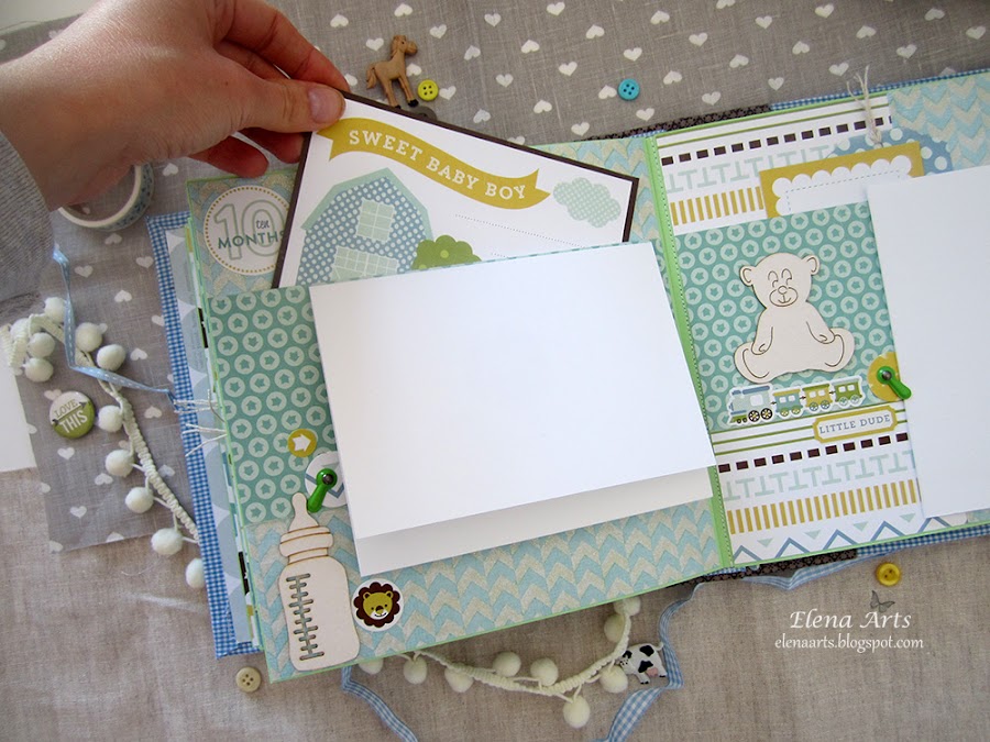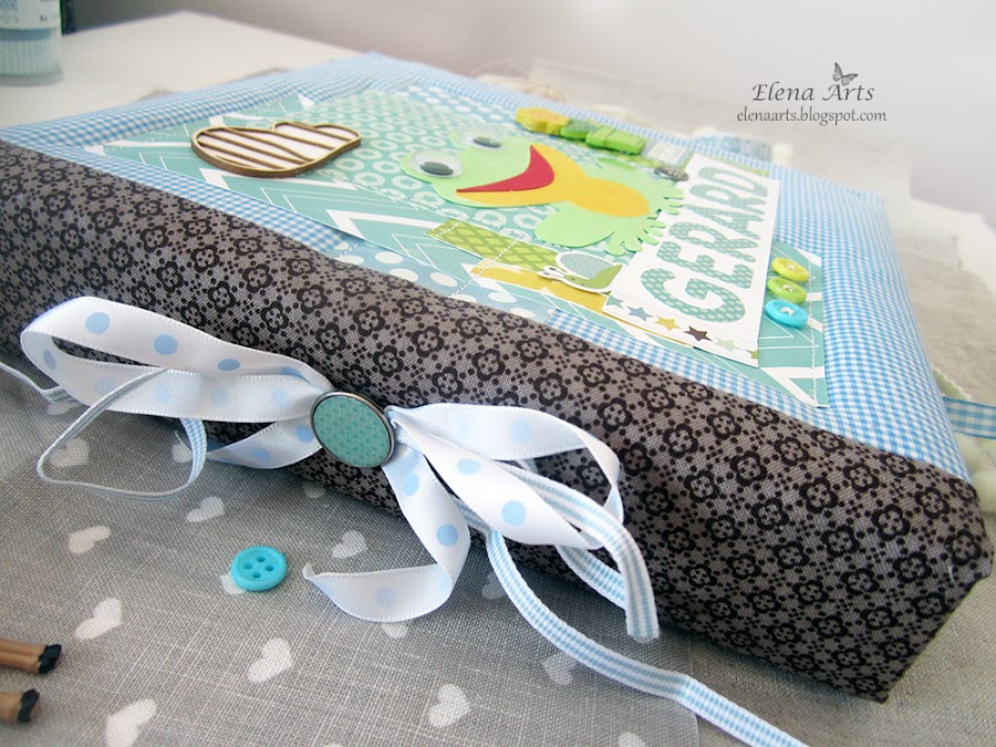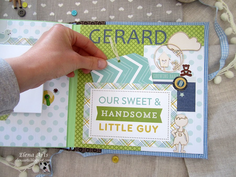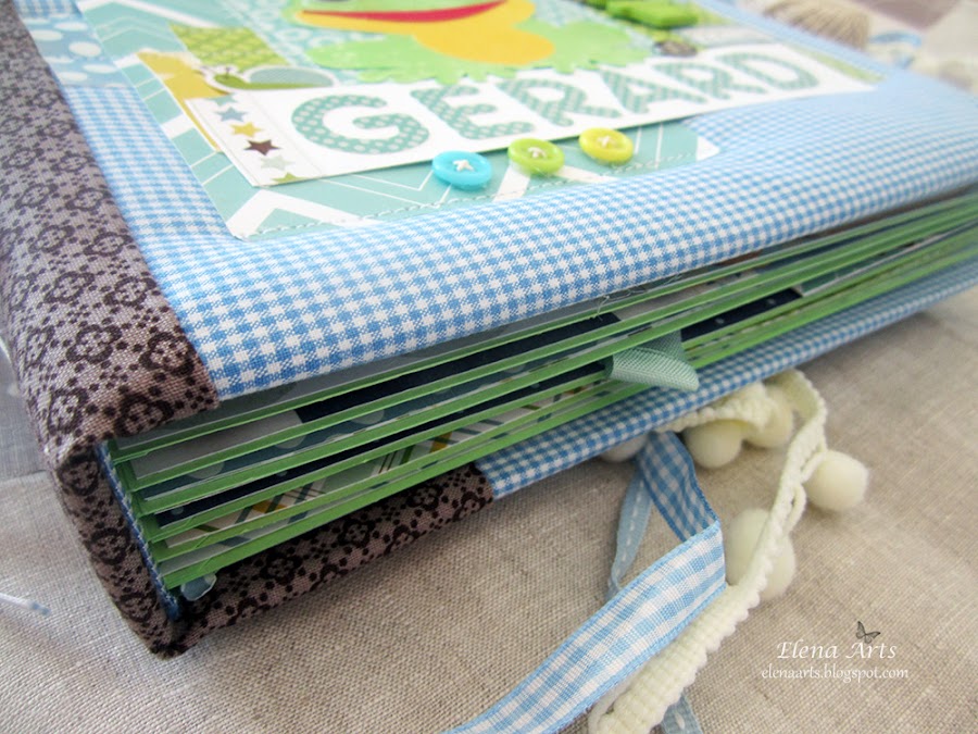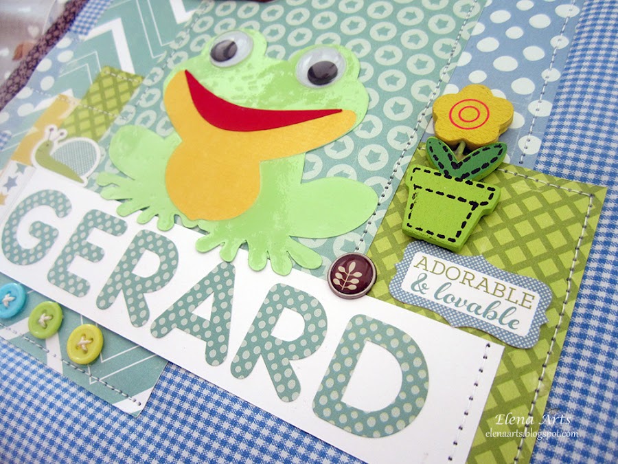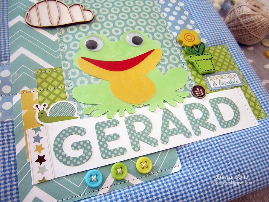 He utilizando los papeles de Hecho Park, la colección "Bundle of Joy 2" Es una colección preciosa de colores azules y verdes que me inspiró a crear este álbum. La ranita en la portada es la protagonista sin duda, y es que a la mamá de Gerard le gusta mucho este verde anfibio jajaja