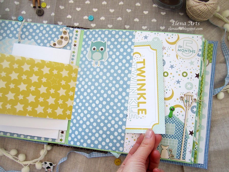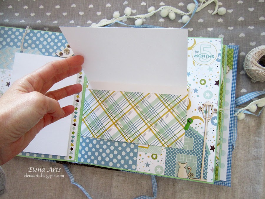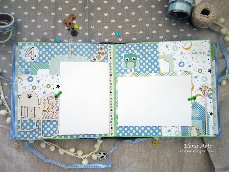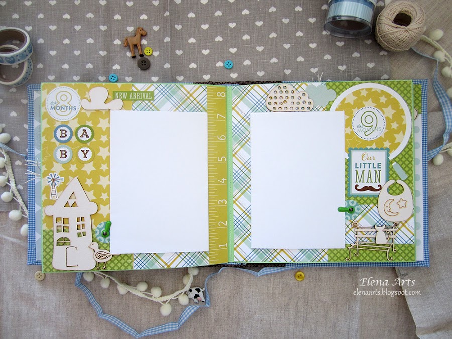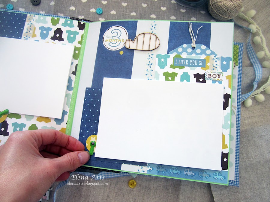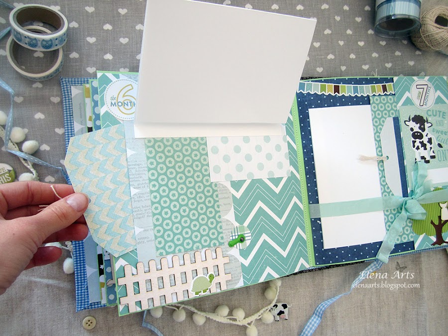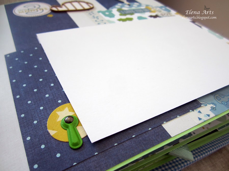 He utilizando los papeles de Hecho Park, la colección "Bundle of Joy 2" Es una colección preciosa de colores azules y verdes que me inspiró a crear este álbum. La ranita en la portada es la protagonista sin duda, y es que a la mamá de Gerard le gusta mucho este verde anfibio jajaja