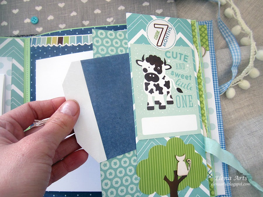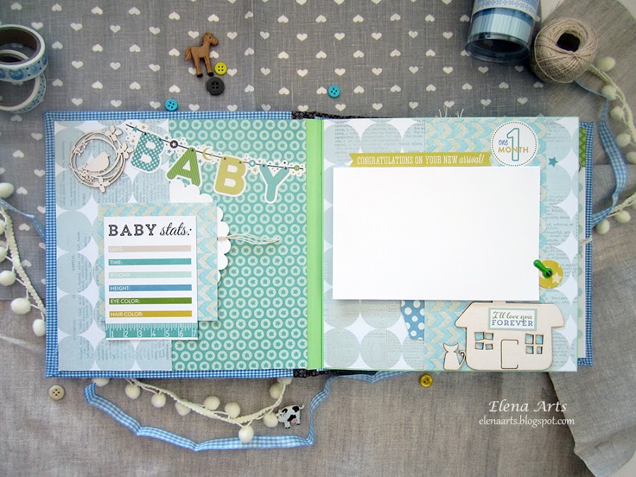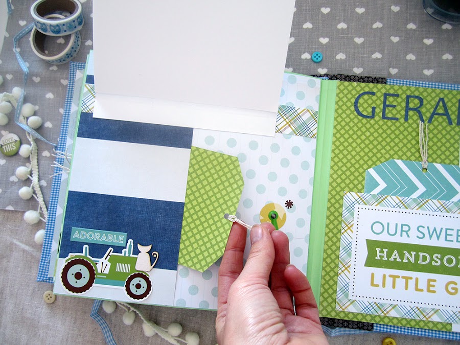 He utilizando los papeles de Hecho Park, la colección "Bundle of Joy 2" Es una colección preciosa de colores azules y verdes que me inspiró a crear este álbum. La ranita en la portada es la protagonista sin duda, y es que a la mamá de Gerard le gusta mucho este verde anfibio jajaja
