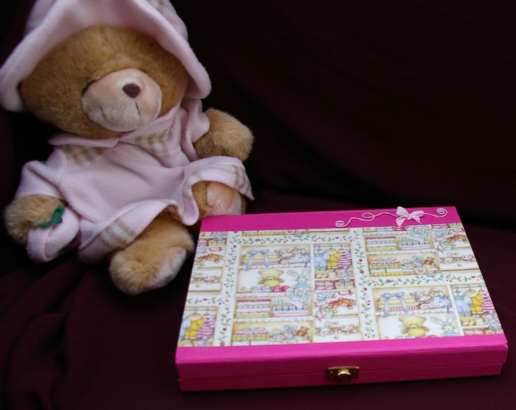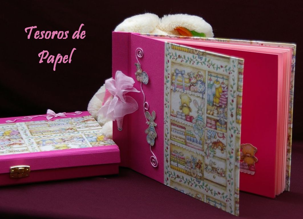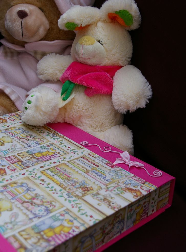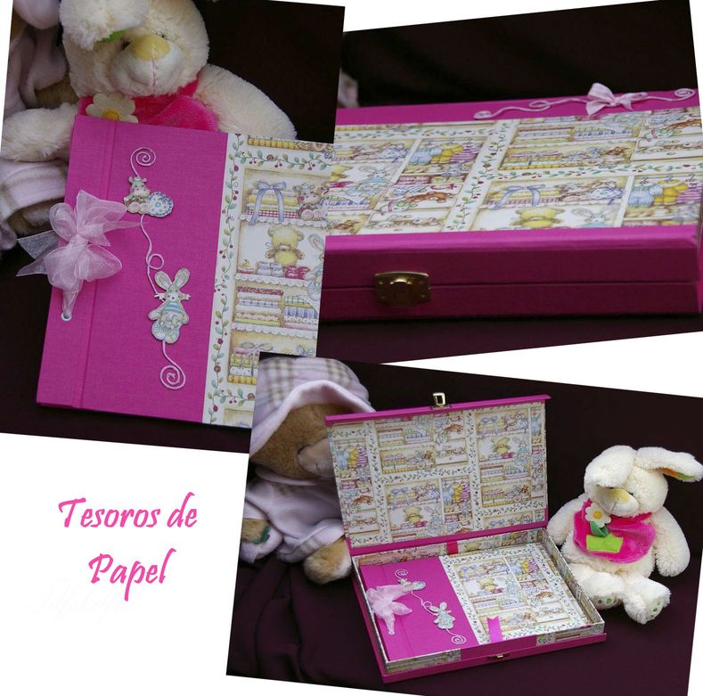 Y para guardar este album de bebé, una caja a juego con el mismo papel, la misma tela color fucsia y los mismos detalles que el album.