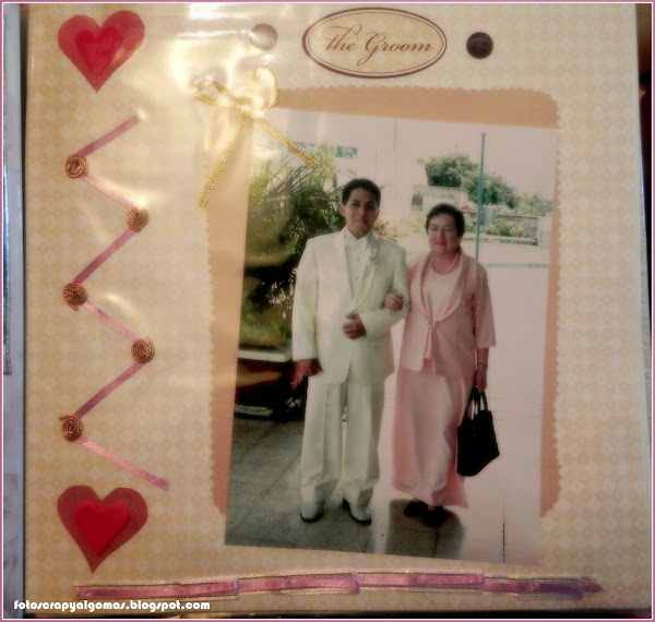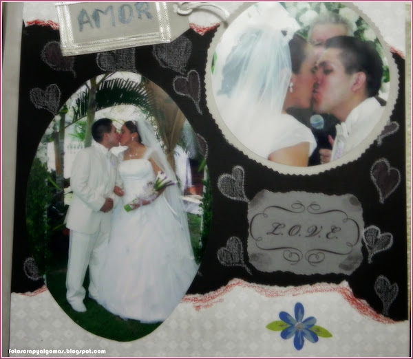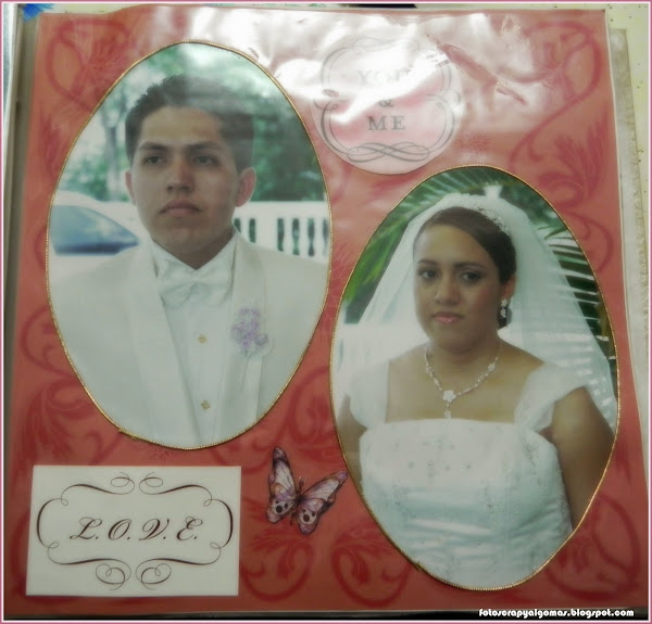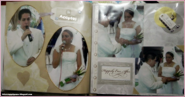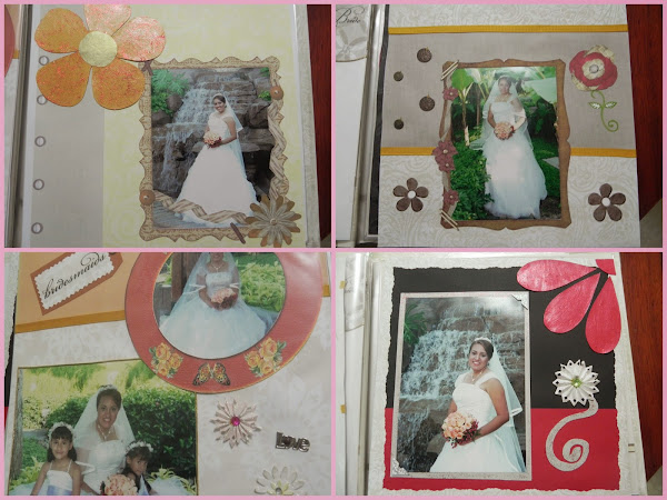 Ahora quiero enseñarte unos Layout muy especiales para mi, que me traen gratos recuerdo, el 7 de Abril cumplí 8 años de casada: Un día para no olvidar, un día hermoso, un día del cual quería tener un super recuerdo, es por eso que cuando me entere de como se llamaba lo que yo hacia con ese álbum tan extraño, tan grande, tan diferente que me dieron un día, pues decidí que mis fotos de matrimonio debían ir en un álbum así. Así es como con un poco mas de conocimiento, compre un álbum 12 x 12 pulgadas, un bloc de papel decorado del tema Boda!, unos cuantos embellecedores, y con el resto de cintas, flores y demás cositas que me sobraron de la boda, comencé a decorar mi álbum. Ahora que lo volví abrir para tomarles las fotos me sentí nostalgia, fue una boda hermosa, un día inolvidable, pero lo mas bello es lo que me esta dejando!, 2 hijos hermosos, 1 esposo maravilloso, y una vida llena de aventuras, contando siempre con la bendición de Dios y siendo Jesús el centro de nuestro matrimonio.