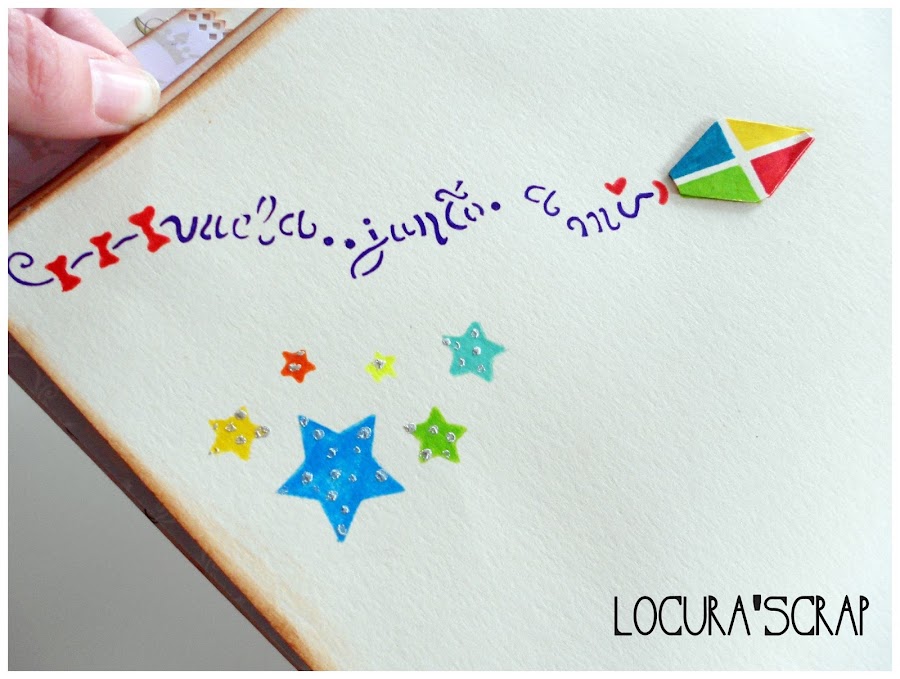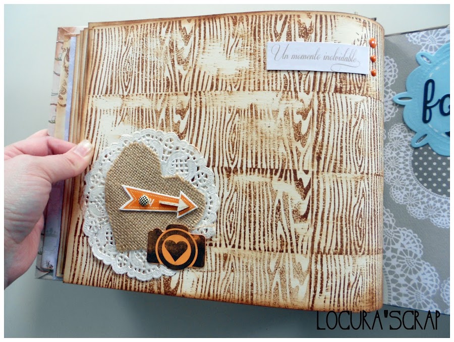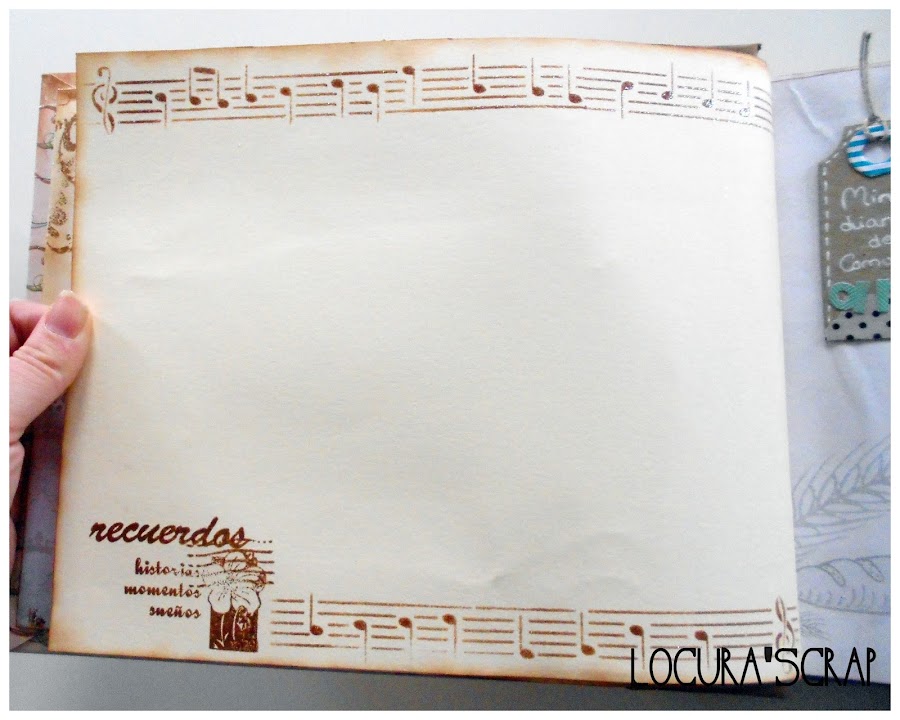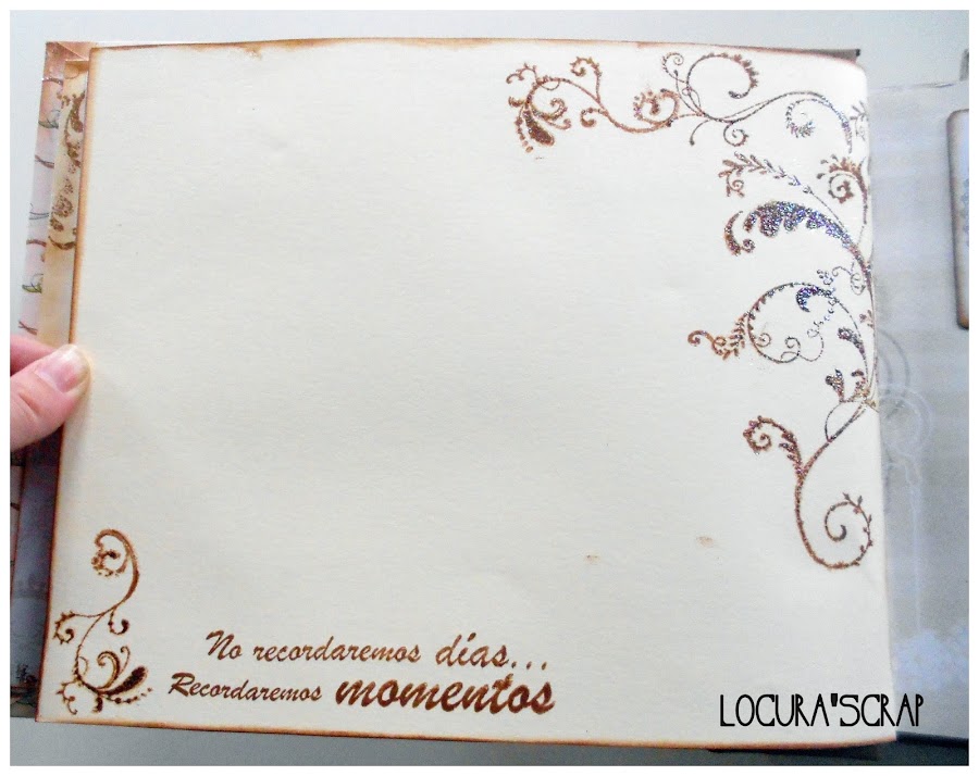Las paginas de dentro están hechas con cartulina beis,en las que e utilizado plantillas stencil ,con tintas distress y polvos de embossing para hacer algunas paginas.