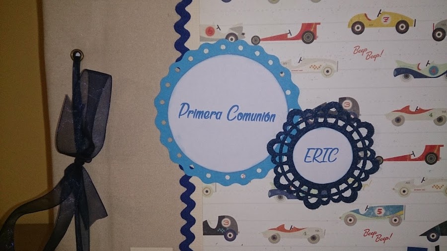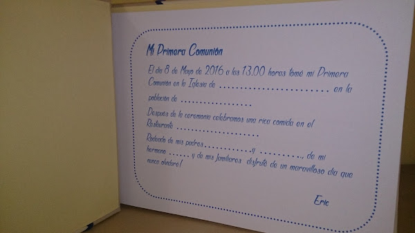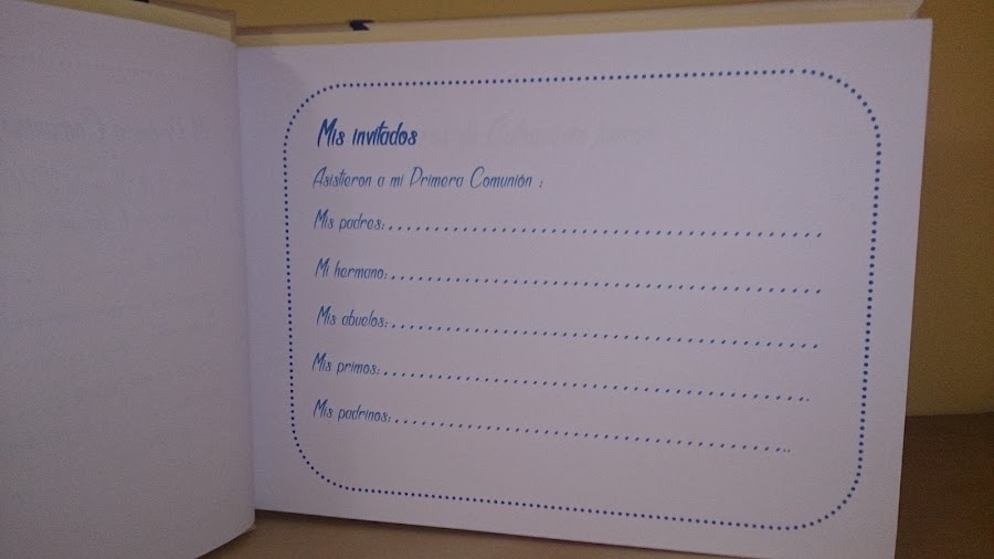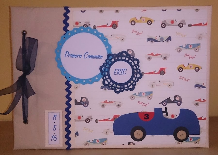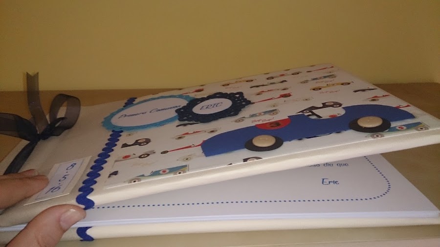 Es un álbum tamaño din A4 con encuadernación de tela y lazo con motivos de coches de carrera retro. En su interior tiene 25 páginas blancas con detalles para que el niño pueda escribir de su puño y letra en que iglesia y restaurante ha tenido lugar la celebración, quienes han sido sus compañeros de catequesis y sus invitados. También hay una página dedicada a las firmas y dedicatorias y otra página que anuncia las fotografías que colocará de ese día tan especial.