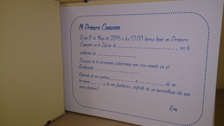 Por fin acabado!!. Esta misma tarde he realizado las fotografías al último álbum de comunión que he elaborado personalmente para Eric, que pronto tomará su Primera Comunión.
