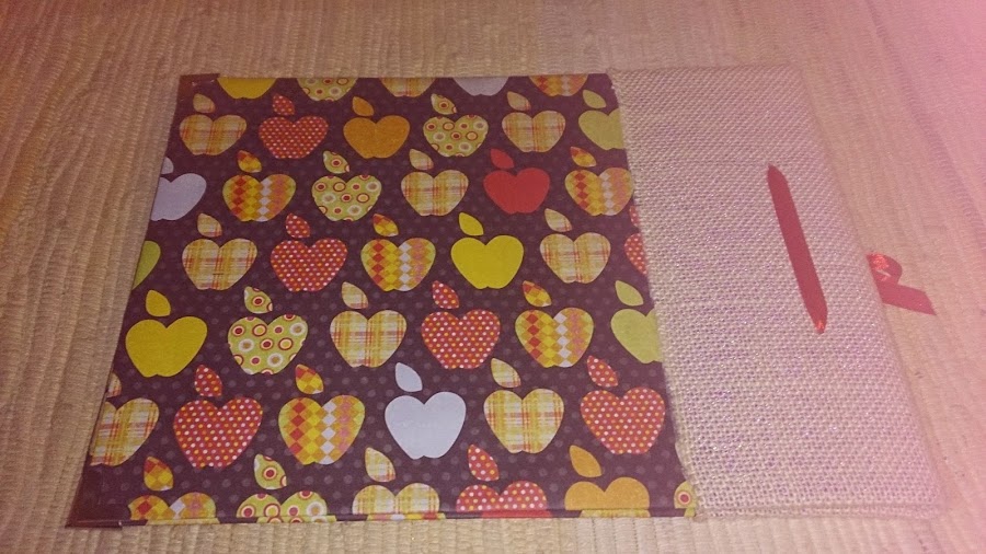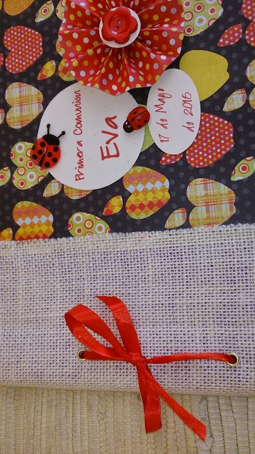 Está elaborado con un papel scrap muy colorido, alegre y forrado el lomo con tela arpillera, la conocida como "tela de saco" de toda la vida. Lo he decorado con una cinta de raso roja combinada con una flor y unas mariquitas también rojas.