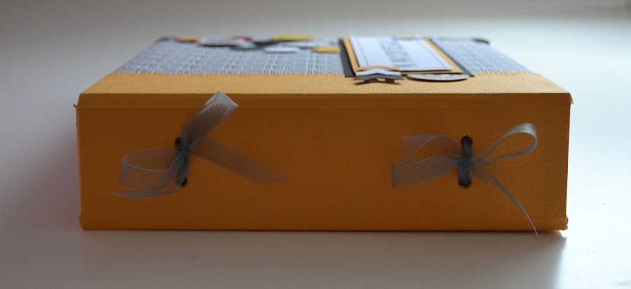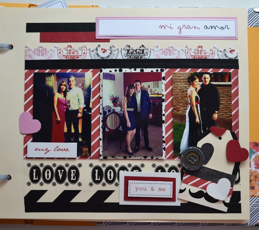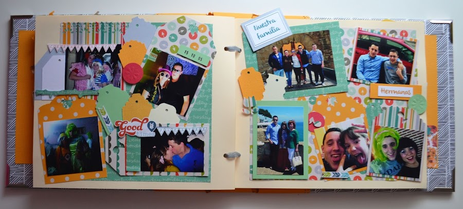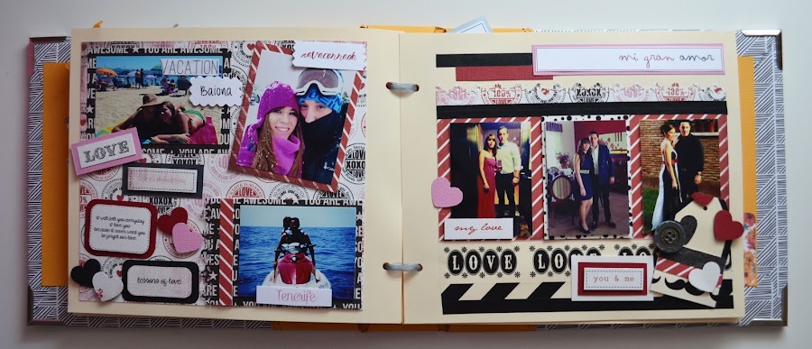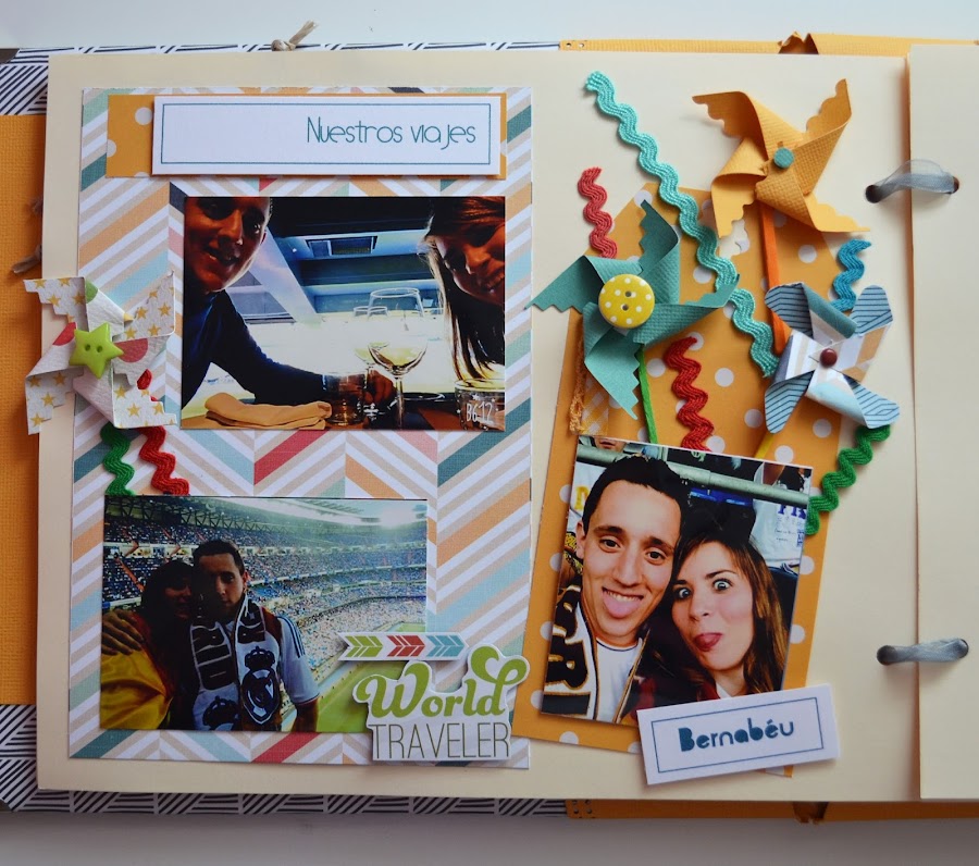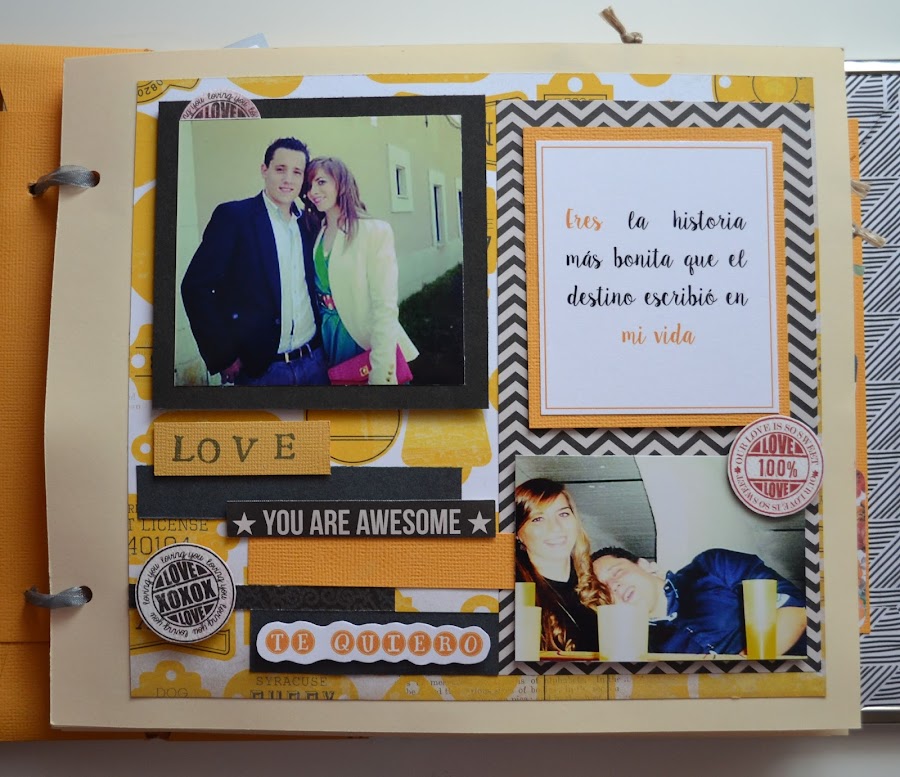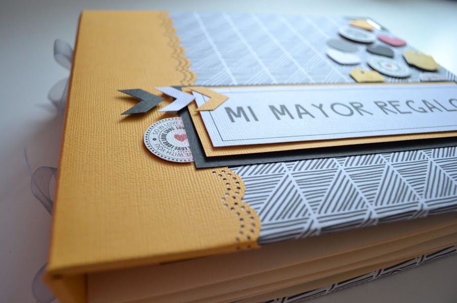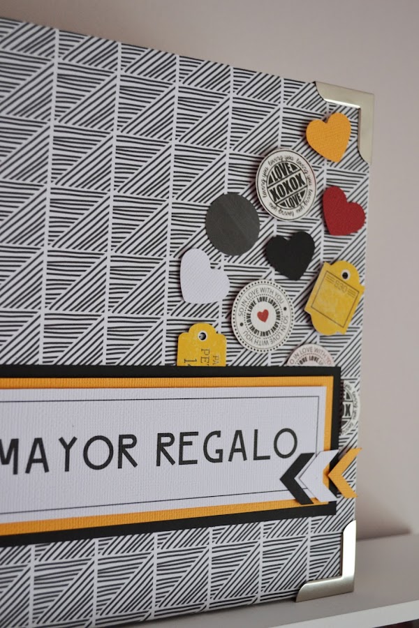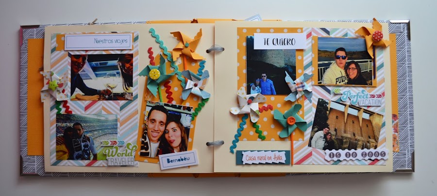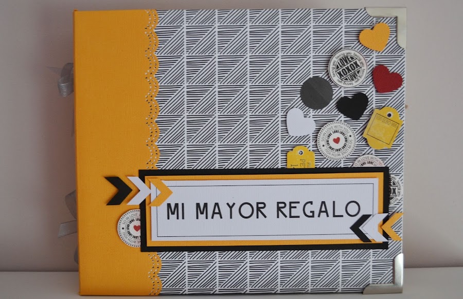 Para decorarle he utilizado papeles estampados de colores, lisos y con texturas muy chulas que han dado un aspecto 10!!! La portada y la caja tienen un estampado en blanco y negro y decoración en amarillo con algún toque en color rojo. Las páginas están sujetas a la portada con unos lazos grises. Para la decoración de las páginas he utilizado colores muy distintos: la primera en amarillo y negro a juego con la portada; las segundas en verde y textura de madera; las siguientes de colores muy divertidos, con muchos molinillos; luego va el turno del negro, rojo y rosa; y por último con los amigos y familia, mucho colorcito de nuevo.