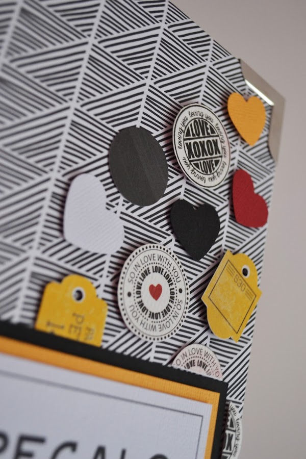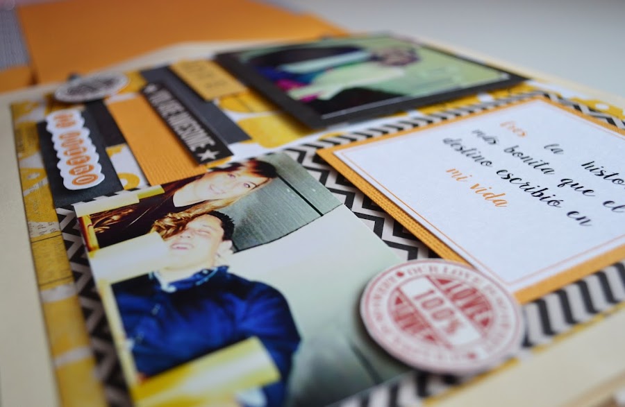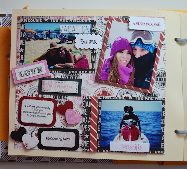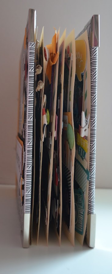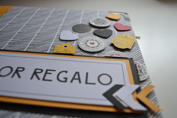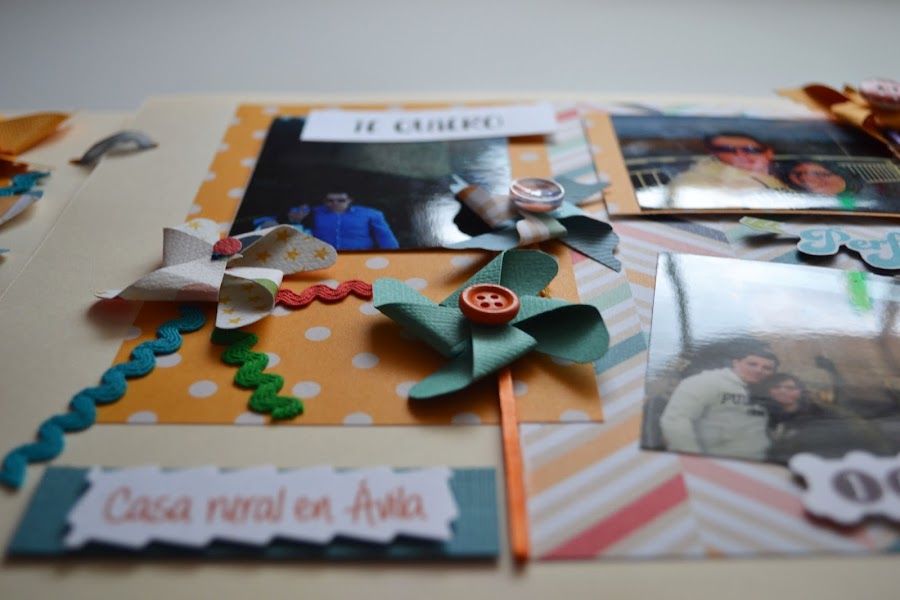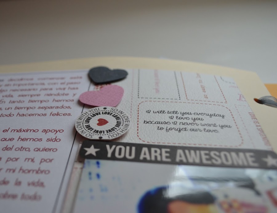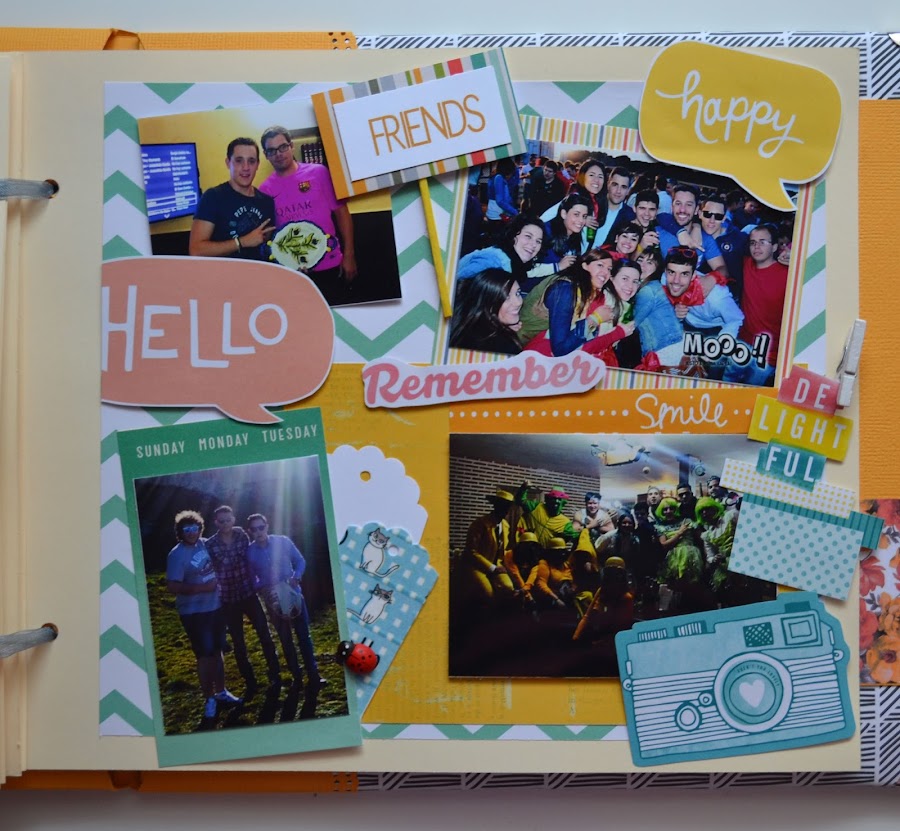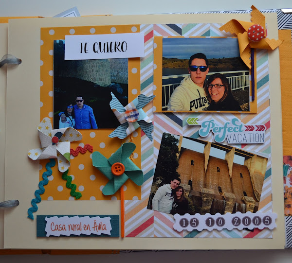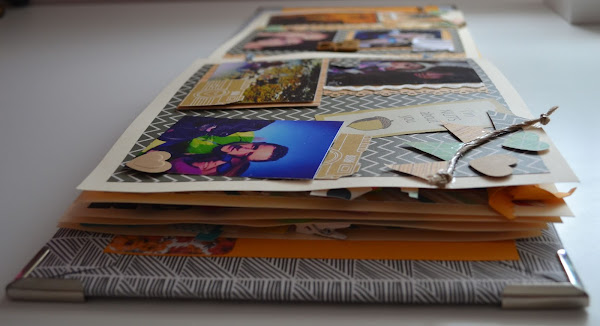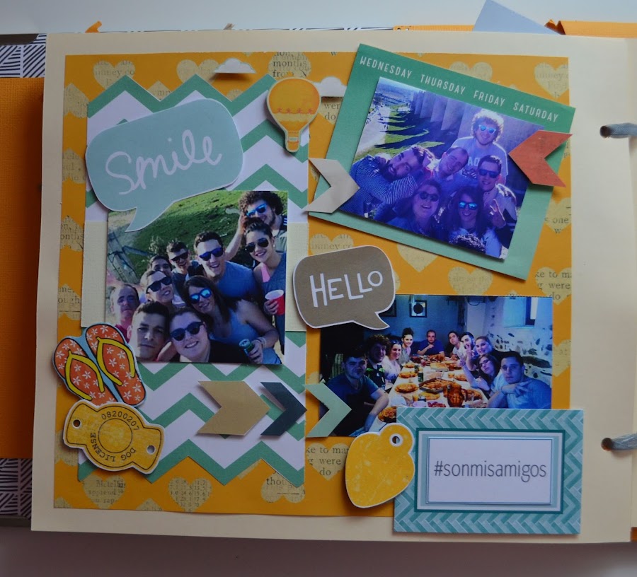 Para decorarle he utilizado papeles estampados de colores, lisos y con texturas muy chulas que han dado un aspecto 10!!! La portada y la caja tienen un estampado en blanco y negro y decoración en amarillo con algún toque en color rojo. Las páginas están sujetas a la portada con unos lazos grises. Para la decoración de las páginas he utilizado colores muy distintos: la primera en amarillo y negro a juego con la portada; las segundas en verde y textura de madera; las siguientes de colores muy divertidos, con muchos molinillos; luego va el turno del negro, rojo y rosa; y por último con los amigos y familia, mucho colorcito de nuevo.