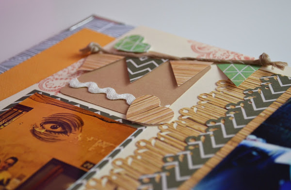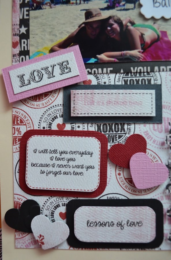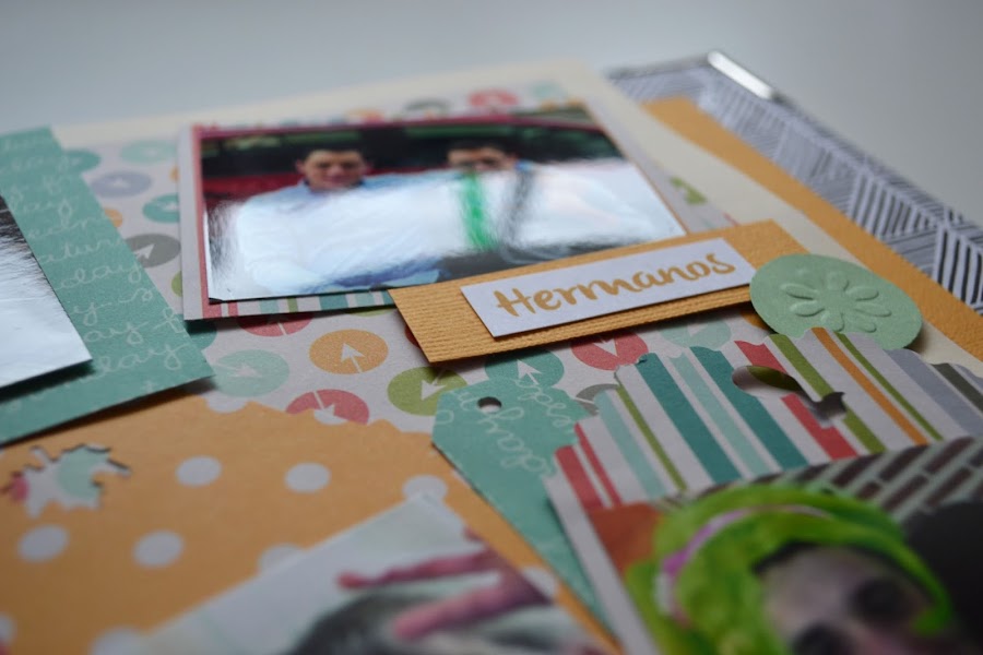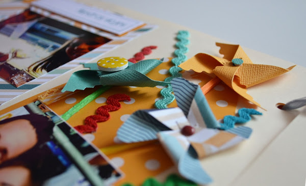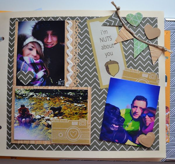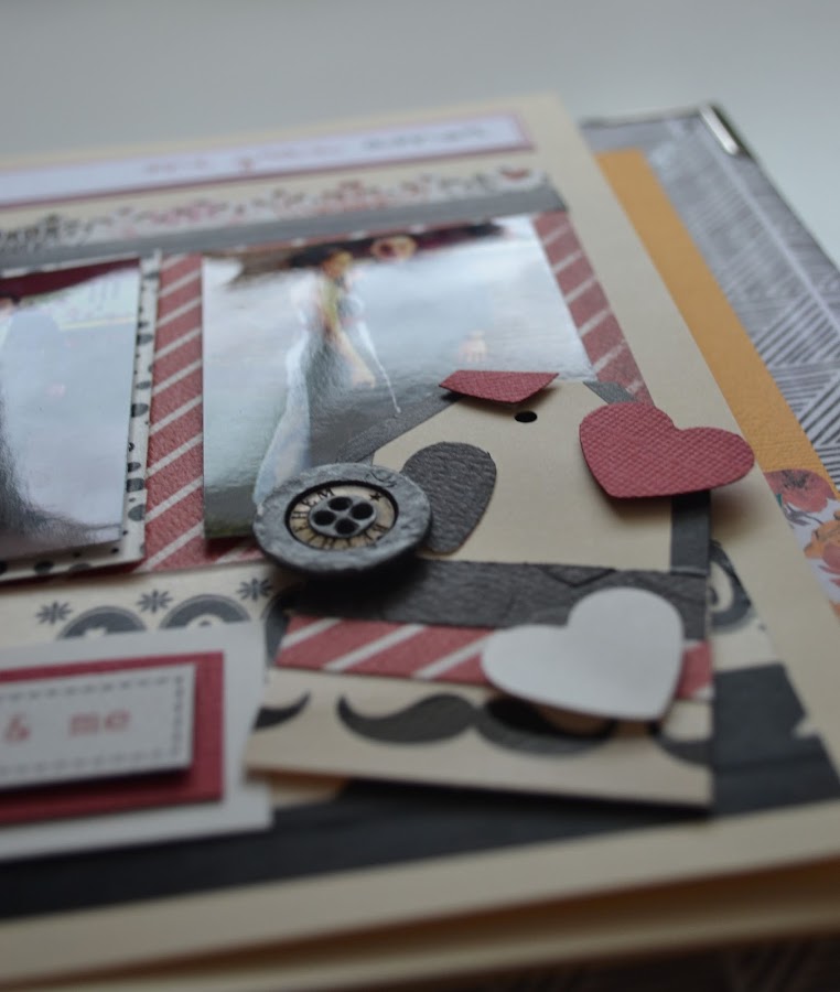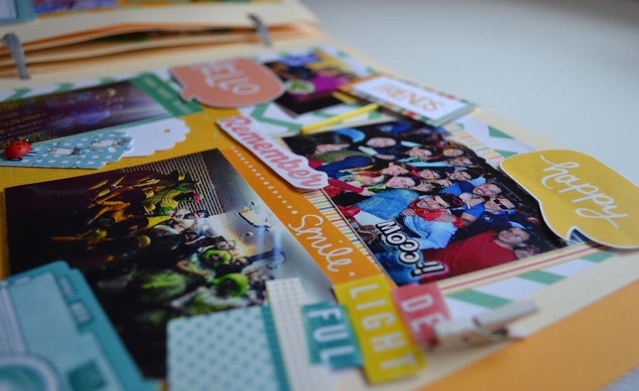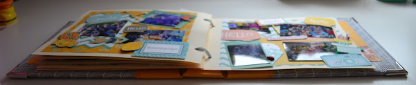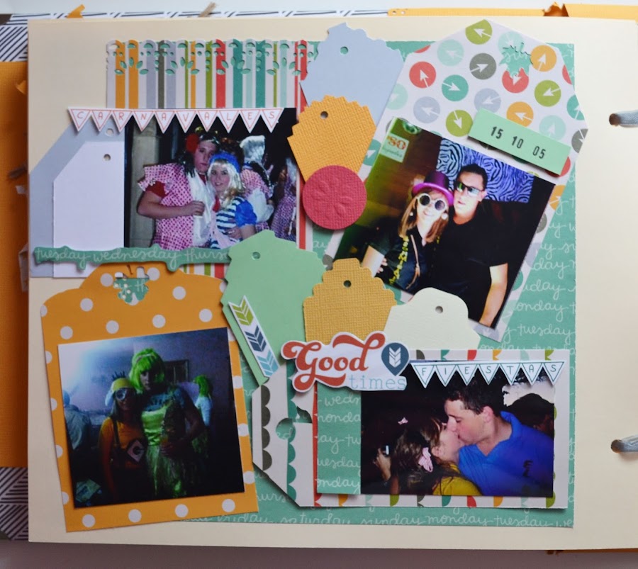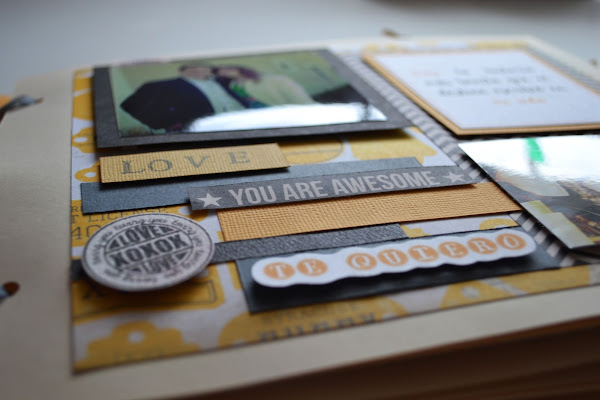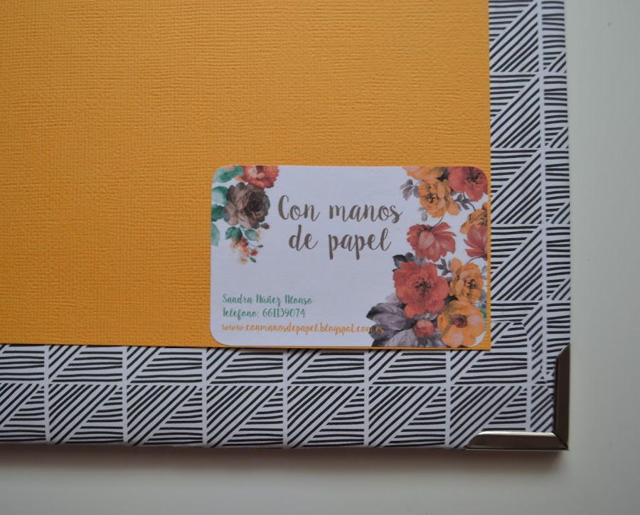 Para decorarle he utilizado papeles estampados de colores, lisos y con texturas muy chulas que han dado un aspecto 10!!! La portada y la caja tienen un estampado en blanco y negro y decoración en amarillo con algún toque en color rojo. Las páginas están sujetas a la portada con unos lazos grises. Para la decoración de las páginas he utilizado colores muy distintos: la primera en amarillo y negro a juego con la portada; las segundas en verde y textura de madera; las siguientes de colores muy divertidos, con muchos molinillos; luego va el turno del negro, rojo y rosa; y por último con los amigos y familia, mucho colorcito de nuevo.