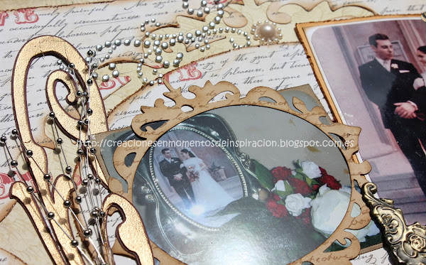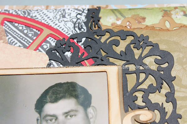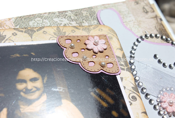 Las tres fotos que componen está primera lámina están enmarcadas con dos marcos de diferentes gruesos, el exterior y de mayor medida está entintado con Distress Ink - Vintage Photo. Algunas de las esquinas de las fotos están troqueladas con diferentes formas y, como se puede ver en la foto, una de ellas lleva un esquinero recortado con la cricut expression y adornado con perlitas, una flor y punteado imitado al cosido con bolígrafo de punta muy fina en color chocolate.
