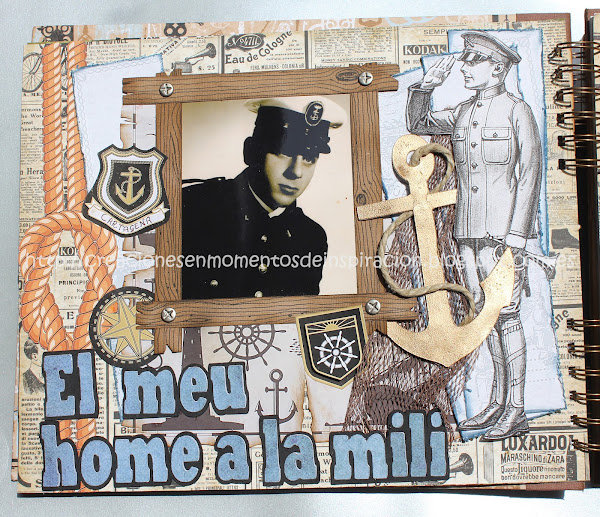 El marco de la foto, para darle aún más el toque masculino, está realizado estampando un sello de imitación madera y recortándolo estilo listones, los cuales están unidos por brads con forma de tornillos (¡¡me encantan!!). Los símbolos navales también están imprimidos y recortados... El toque personal se lo da la palabra "Cartagena", lugar donde realizó el servicio militar.