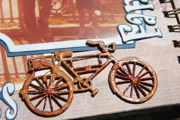 Como las fotos ya tenían mucho protagonismo, aquí la deccoración fue la justa y necesaria. Opté por una sencilla Bicicleta - Chipboard de Kaisercraft, entintada con Distress Ink - Vintage Photo y con una gruesa capa de Crackle Accents y dejado secar durante horas para conseguir el craquelado de envejecido.