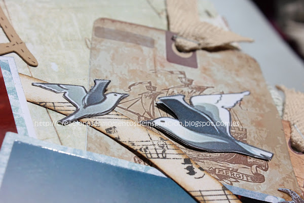 En el mismo lateral pero en la parte superior nos encontramos, como fondo un tag con un sello de un barco pirata y sobre él, dos gaviotas, imprimidas y cortadas dos veces, pegándolas entre sí, dejando las alas sin pegar para darle volumen.