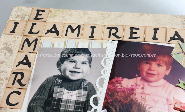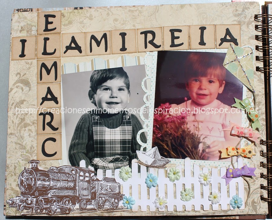 Como podéis observar, la página está dedicada a sus hijos, "El Marc i La Mireia" ("Marc y Mireia"), un tanto difícil a la hora de terminarla de decorar ya que no quería caer en la sosería de unos simples juguetes decorándola... Ambas fotos están reveladas en un tamaño 10x12 cm para que no se vieran demasiado pequeñas y llevan el mismo marco cada una, simplemente que la foto de Mireia lleva recortado todo el detalle del marco y en cambio en el marco de Marc tan solo lleva la silueta.