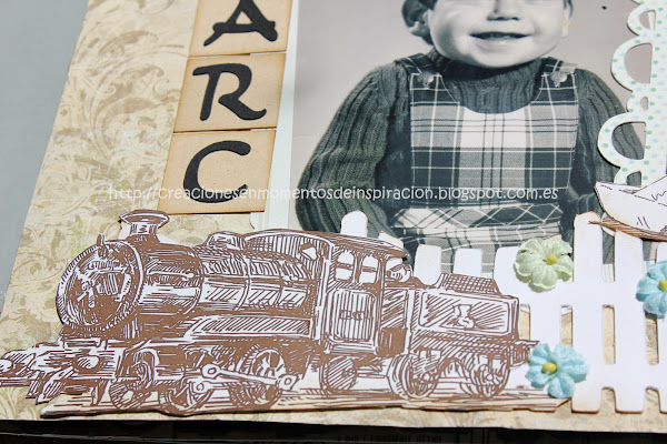 En el otro lateral, en el izquierdo, nos encontramos un recorte de una lámina de Webster"s Pages - Yatch club collection. El título, como podéis ver, muy sencillo, recortado en cartulina color arena y marcado un fino cosido con punta finas color chocolate.