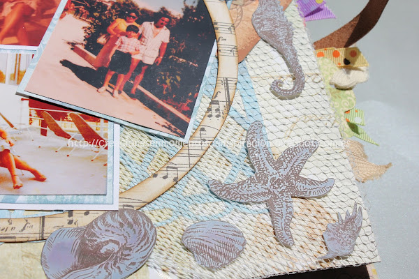 En la parte inferior derecha podéis ver como toda la esquina la ocupa, nuevamente, una red... Una red de bolsa de ajos blanca... Las conchas, estrella de mar y caballito están imprimidos en gran calidad en cartulina y recortados. Las fotos llevan o uno o varios marcos, todos ellos diferentes pero con papeles perfectamente combinables entre ellos.