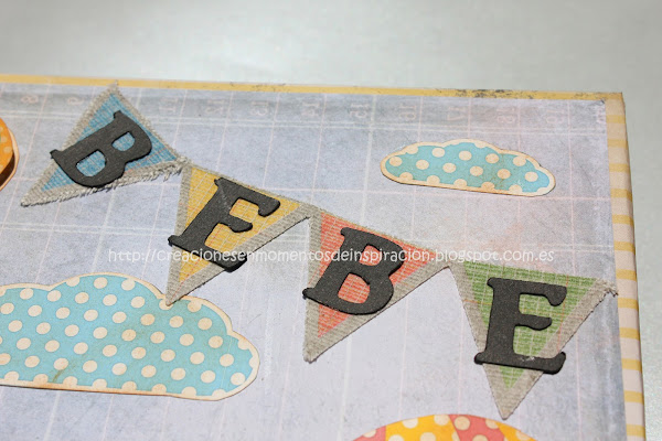 En la parte superior derecha una banderola de tela de My little Yellow Bicycle - HC201 con las letras de la palabra BEBE en cada una de las banderolas. Las nubes son recortes de una lámina.