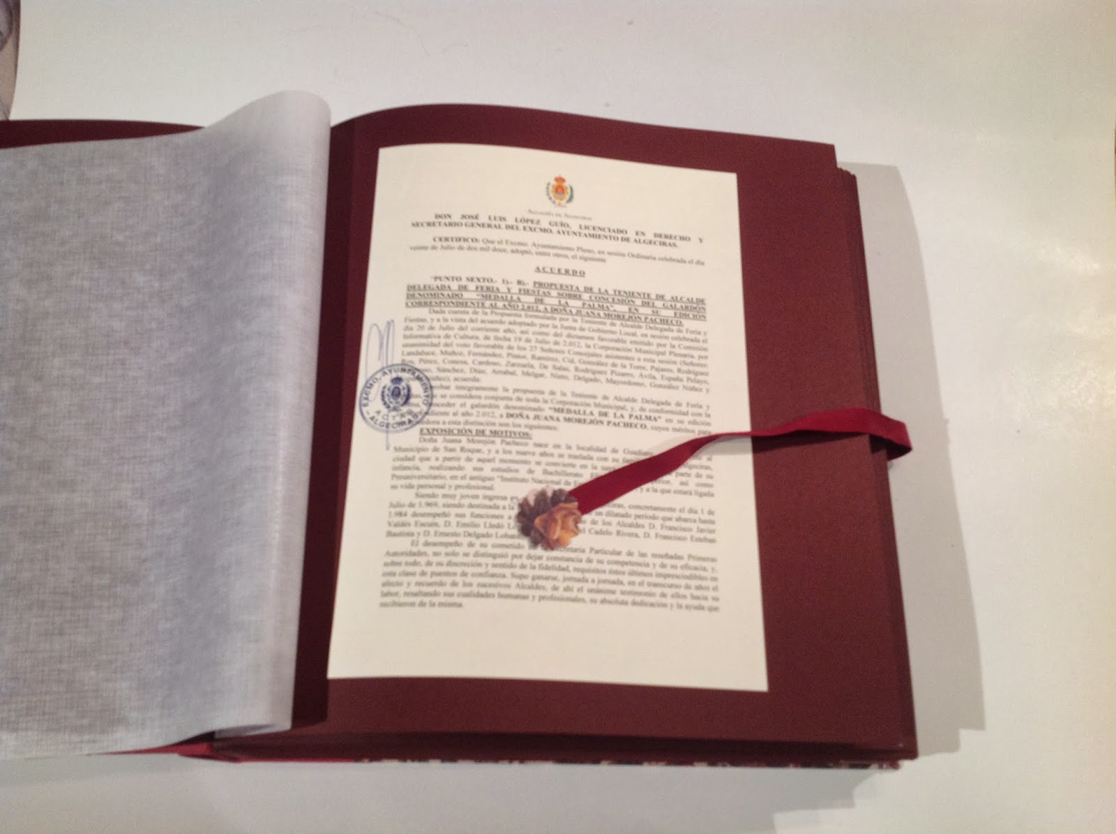 Album de fotos con un significado muy emotivo, contiene todos los documentos, fotos, etc.. de la entrega de la Medalla de la Palma de la ciudad de Algeciras a una persona muy especial.