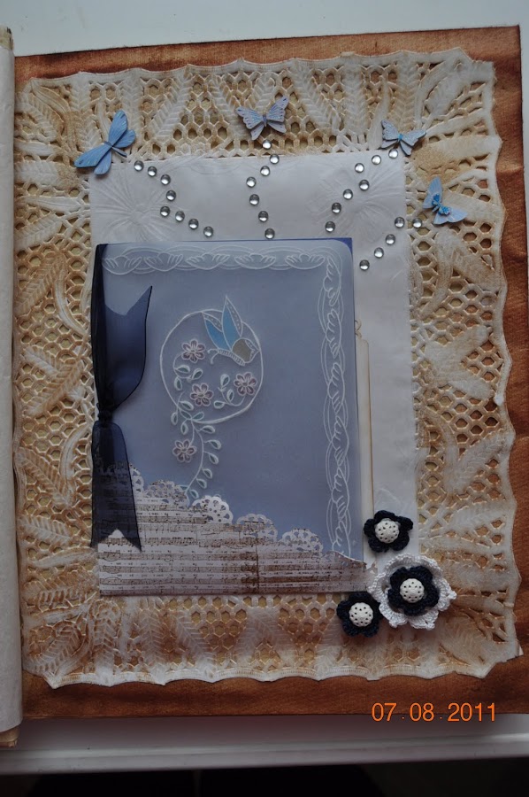 Entinté con Vintage Photo la hoja del álbum y el borde de la blonda que pegué encima. Troquelé el borde del sobre donde va el recordatorio y utilicé un sello de notas musicales para decorarlo.