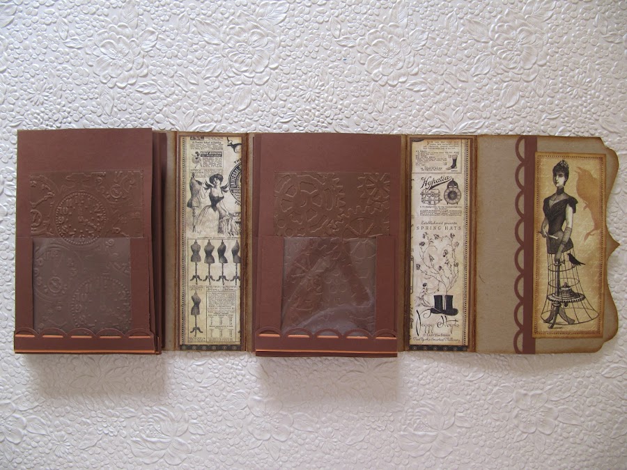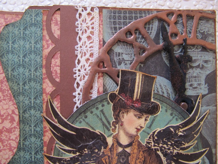 Utilice los papeles de Steampunk Debutante de Graphic 45, como colores el marrón y naranja, placas de embosar de Tim H., UTE, y como dice ella "para darle el toque romántico" un pequeño encaje. Con estos detalles, se puede decir y sino me equivoco mucho, es muy vintage, es muy Yolanda!