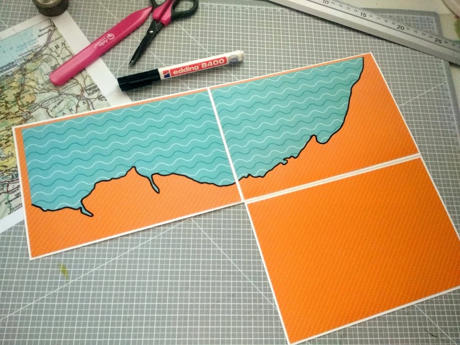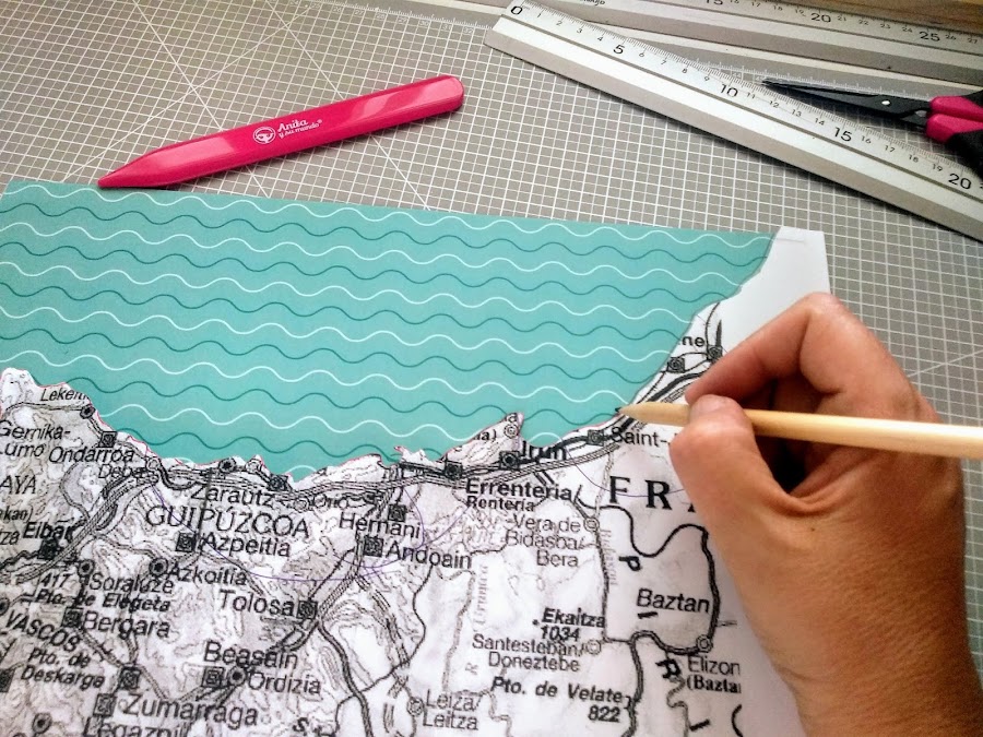 Descargamos el mapa que necesitamos y lo imprimimos al tamaño adecuado (el de este álbum lo imprimí a un tamaño de A3) Como tenía costa, fui recortando todo el perfil, lo marqué y recorté en uno de los papeles reservados. La unión entre mar y tierra la marcamos con un rotulador negro.