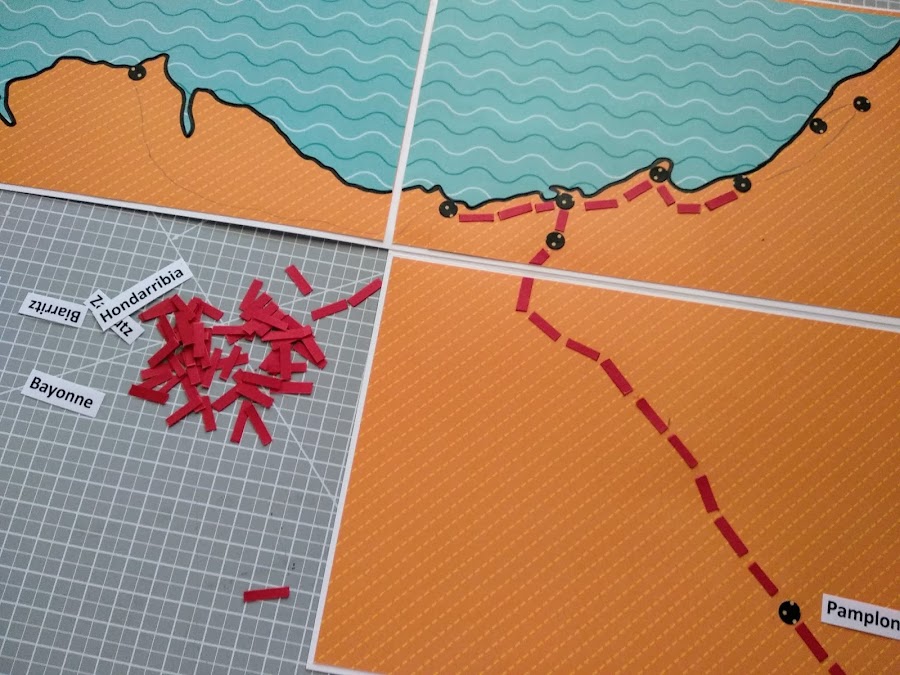 Ahora tocar ir colocando todos los detalles del mapa (localizaciones, nombres de las localidades...), incluida la ruta a base de pequeños trocicos de cartulina roja.