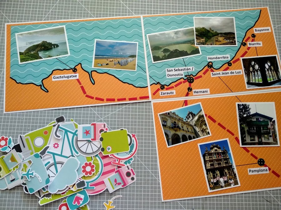 Llega el momento de decorar y unas fotografías (unidas por una línea negra a la ciudad correspondiente) dan el toque personal a nuestro mapa de ruta. El resto, es a gusto de cada uno pero en la colección "Aventura" tienes unos recortables monísimos.