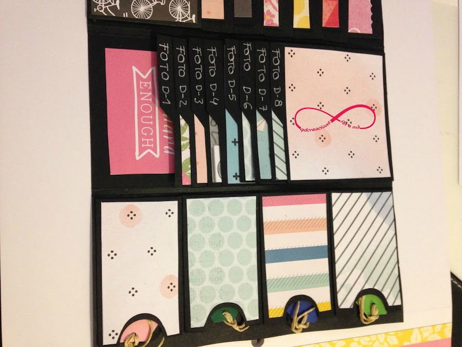 Paso3: Ahora tenéis que pegar en la parte central del álbum pero colocado del revés y superpuestos(mirad la imagen). Y en la solapa podéis poner un texto, en mi caso puse, FOTO D-1, etc...