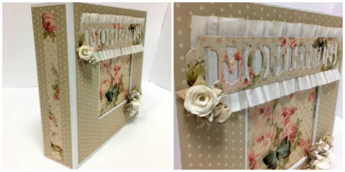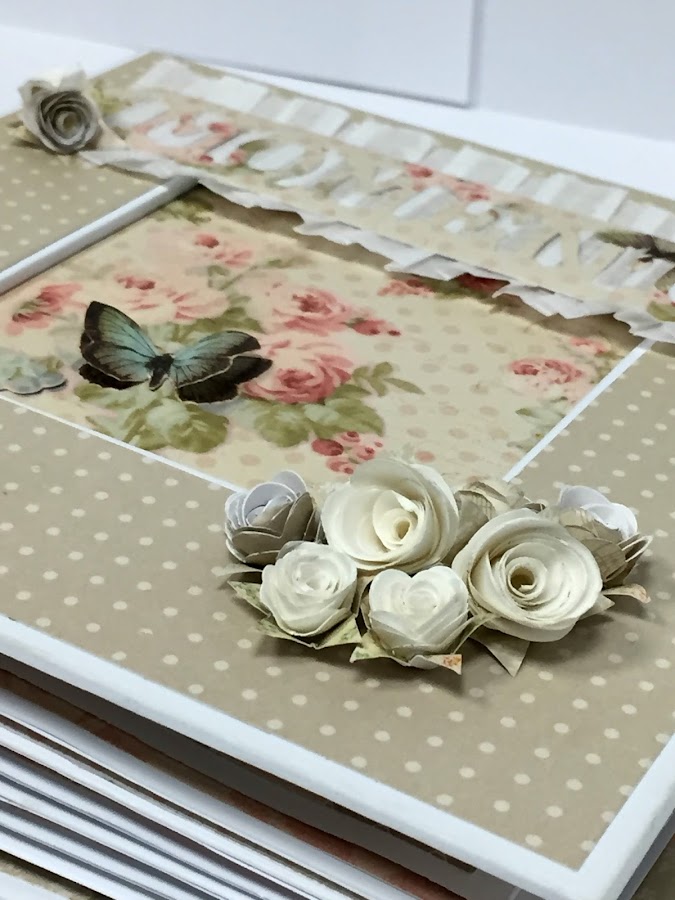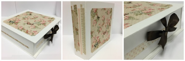 Antes de pasar a enseñarlo por dentro, quiero que veáis la caja que lo guarda, que aunque no nos dio tiempo de hacerla en el curso, sí nos dieron las instrucciones en pdf. Está forrada entera con papel Torreón en color blanco roto y adornada con papeles de la misma colección que la usada para el álbum. Muy sencilla y sin mucho adorno para que se pueda guardar bien, o poner encima algo y así no se estropee.
