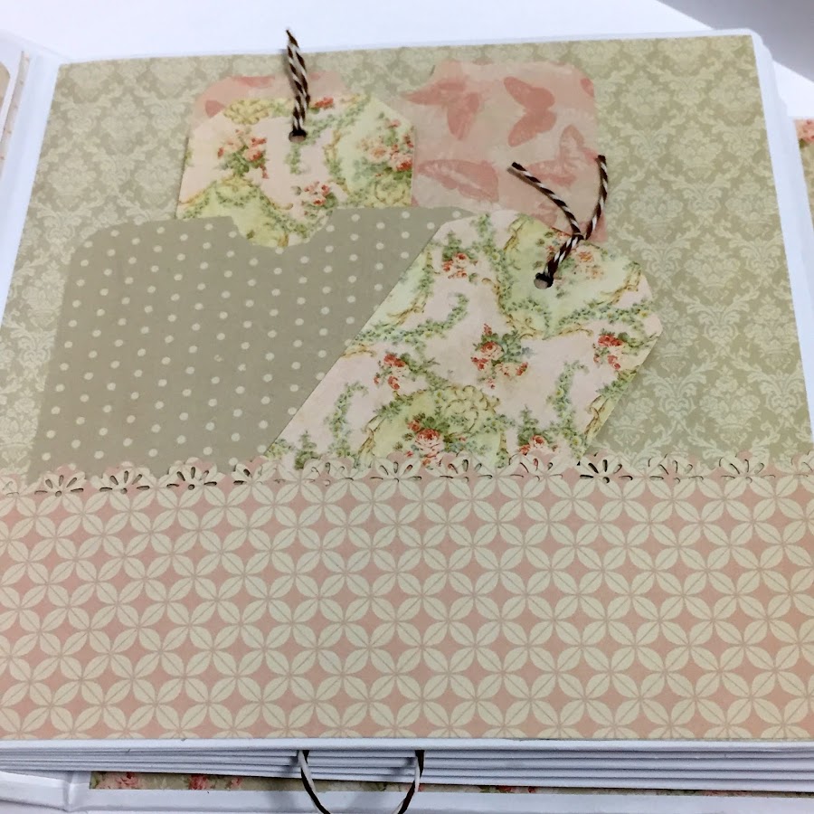 La hoja que sigue os la enseño en tres fotografías. Cerrado con lazo. Abierto aparecen las pestañas. Y con las pestañas desplegadas. Espacio extra para poner más fotografías.