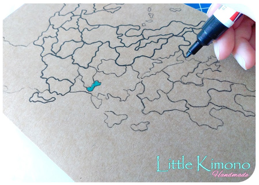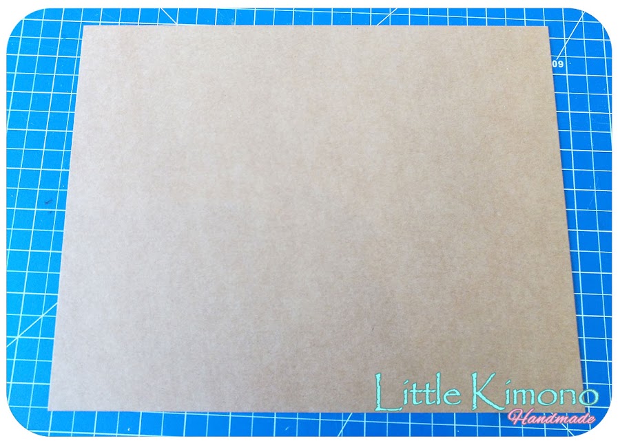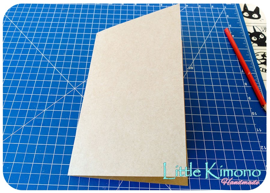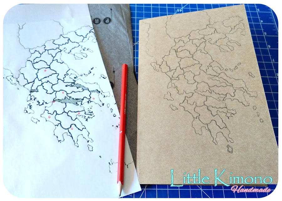 1. Con la cartulina kraft (la mía es de Grafoplas y la encontráis en Amazon), cortamos el tamaño deseado del midori, el mío es de 30x24cm, doblamos por la mitad y dibujamos el mapa con ayuda de papel de calcar.