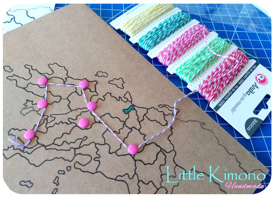4. Con el bakers twine unimos los puntos para marcar la ruta del viaje.